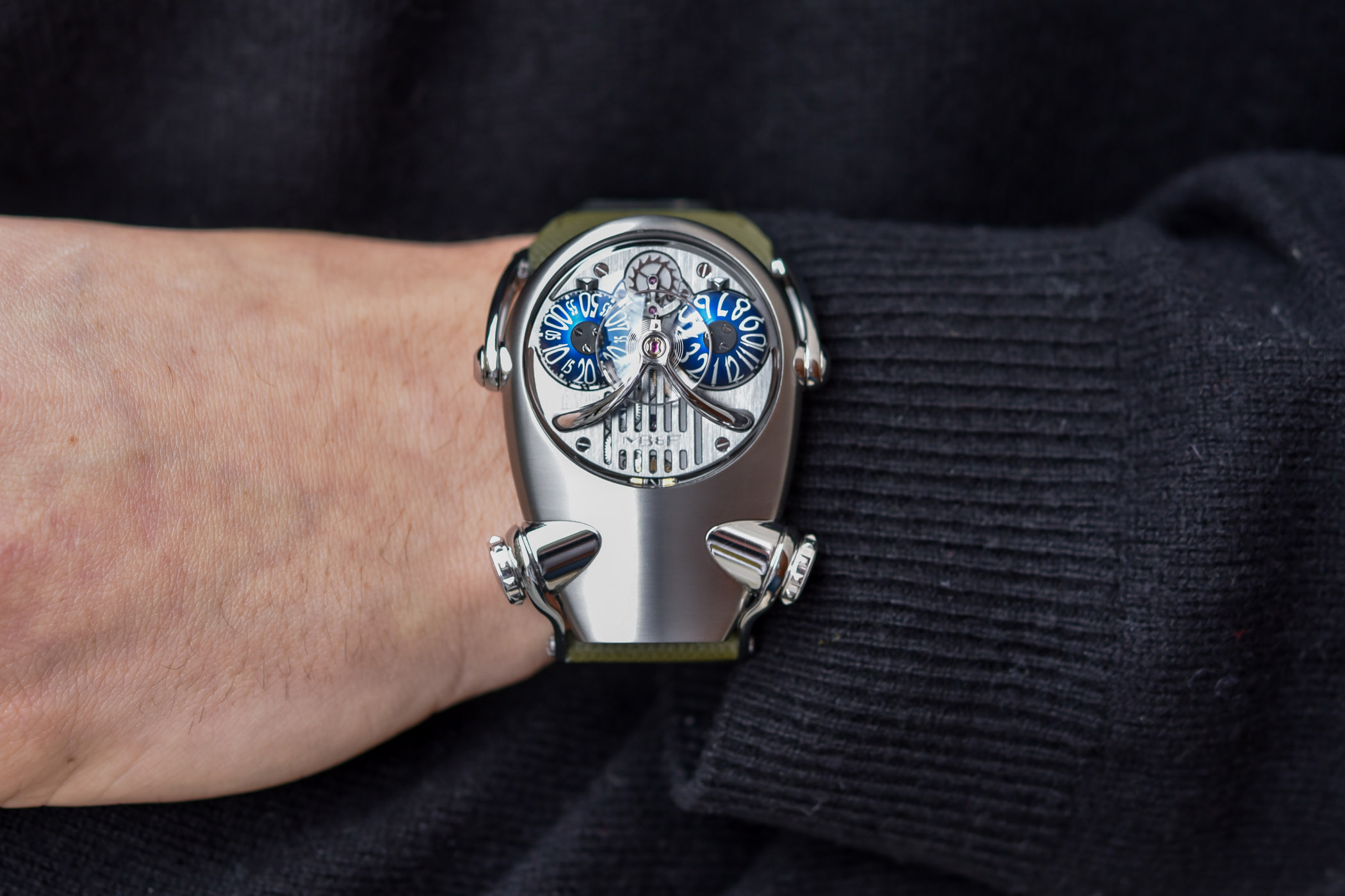 MB&F’s first creation, in 2005, was named the Horological Machine N°1 or HM1 and, as you can see in our retrospective line-up and video, it came with one impressive, space-like design that would become the base for the collection. Unusual design, visible regulators, contrast between round and angular shapes, clear science-fiction inspiration… All of this came from Max’s childhood dreams. Fifteen years later the brand has evolved drastically without betraying its roots. In the interim, MB&F launched a more traditional collection, the Legacy Machines, where steampunk inspirations abound alongside complex mechanisms. Those 15 years have also allowed the brand to define its iconic features: the bubble-like sapphires, the articulated lugs, the combination of materials, the domed “eye-like” time displays, the suspended and oversized balance wheels, the asymmetrical cases… All of them found throughout the collections.