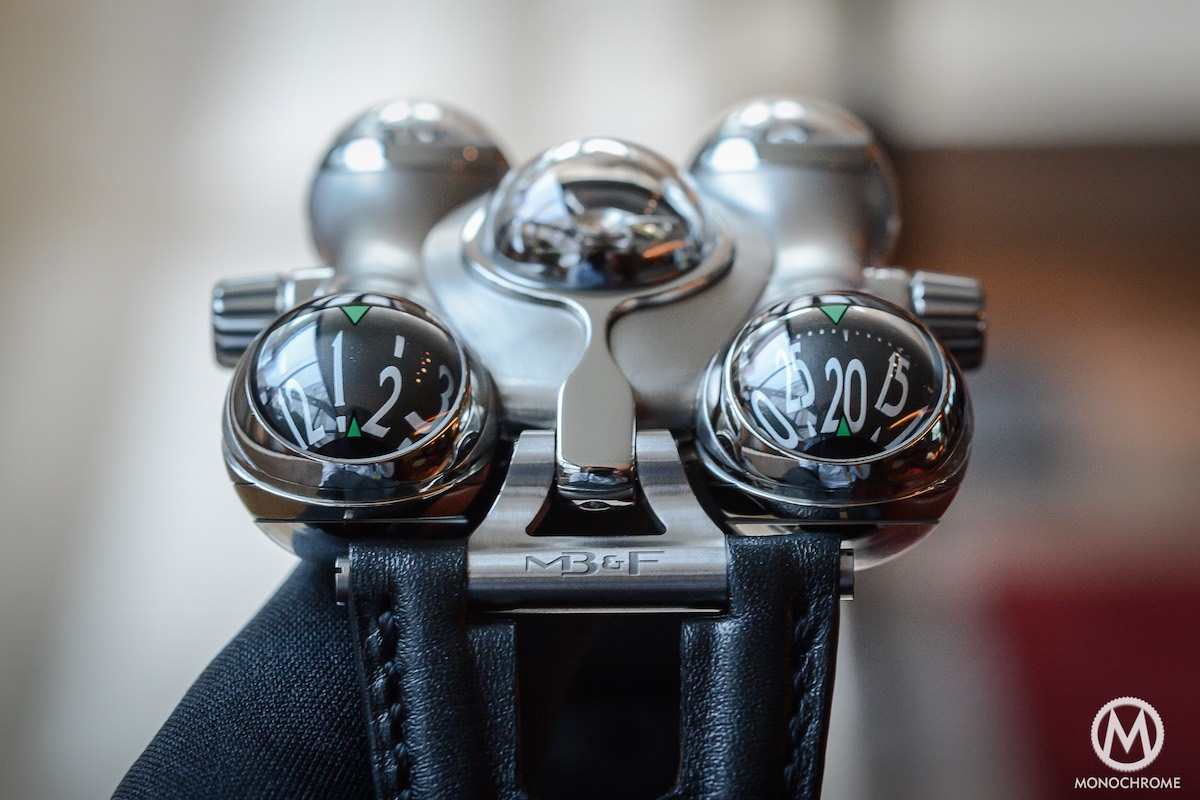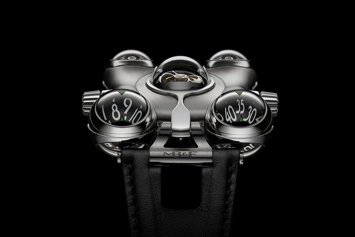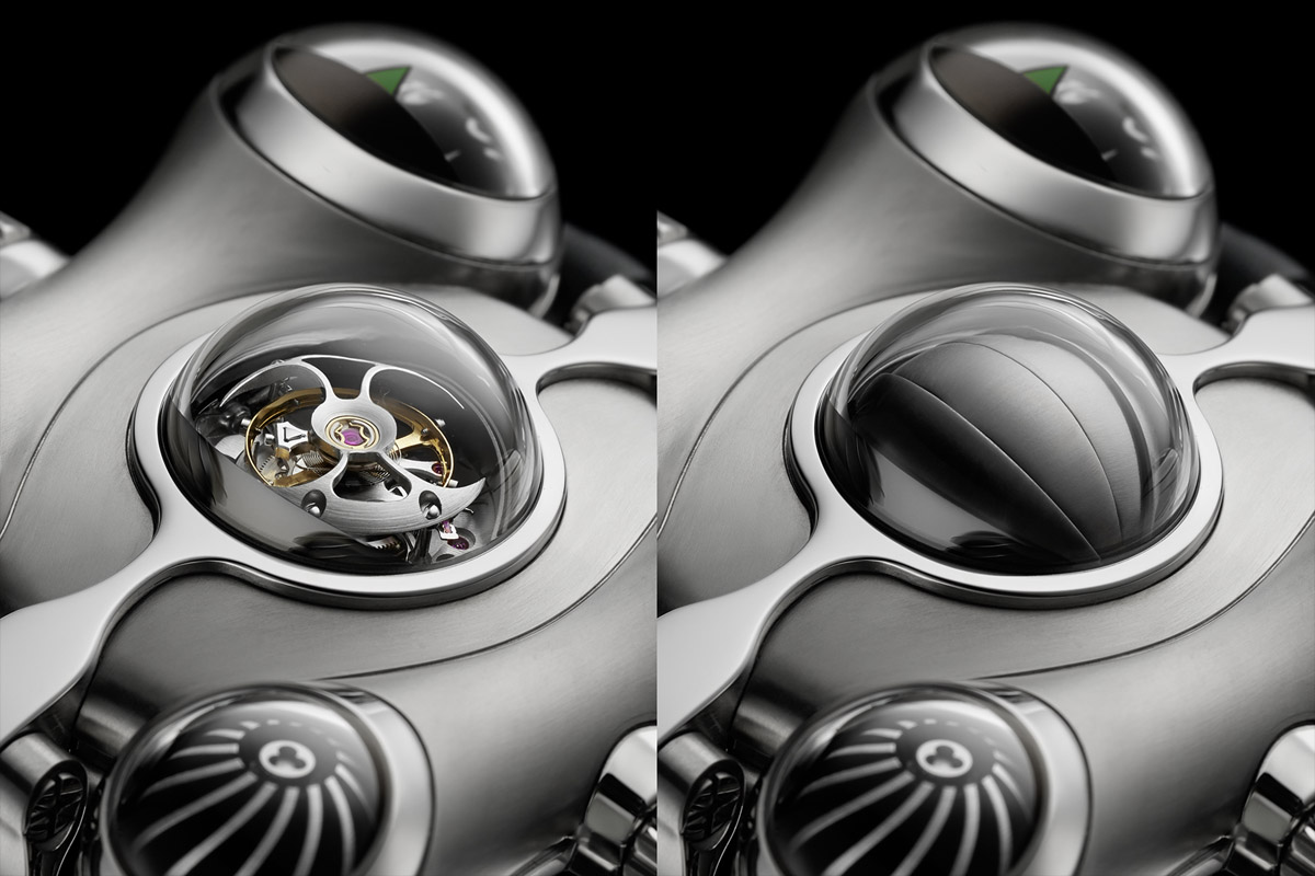 To achieve this very unusual display, the movement is of course quite complicated: a regulating organ on the top, a winding rotor on the back, hours and minuted indicated by semi-spherical aluminium domes on a vertical axis when the movement is classically horizontal. First of all, the movement had been created exclusively for MB&F with David Candaux Horlogerie Créative and required 3 years of development. The complexity comes essentially from the different axes, thus involving many pivots and gears trains to transfer power from the central part to the extremities of the watch. Then, to regulate this ‘engine’, the MB&F team chose to use a flying tourbillon – as we told you displayed in the middle of the watch and that can be protected by a retractable spherical shield that envelopes the tourbillon with six overlapping, curved blades (activated by the left crown). The automatic movement ticks at 18,000bph (2.5Hz), boasts 72 hours of power reserve and is composed of 475 pieces. Last but not least, here comes the cool feature (yes the other ones were already cool, but this one is cooler).
