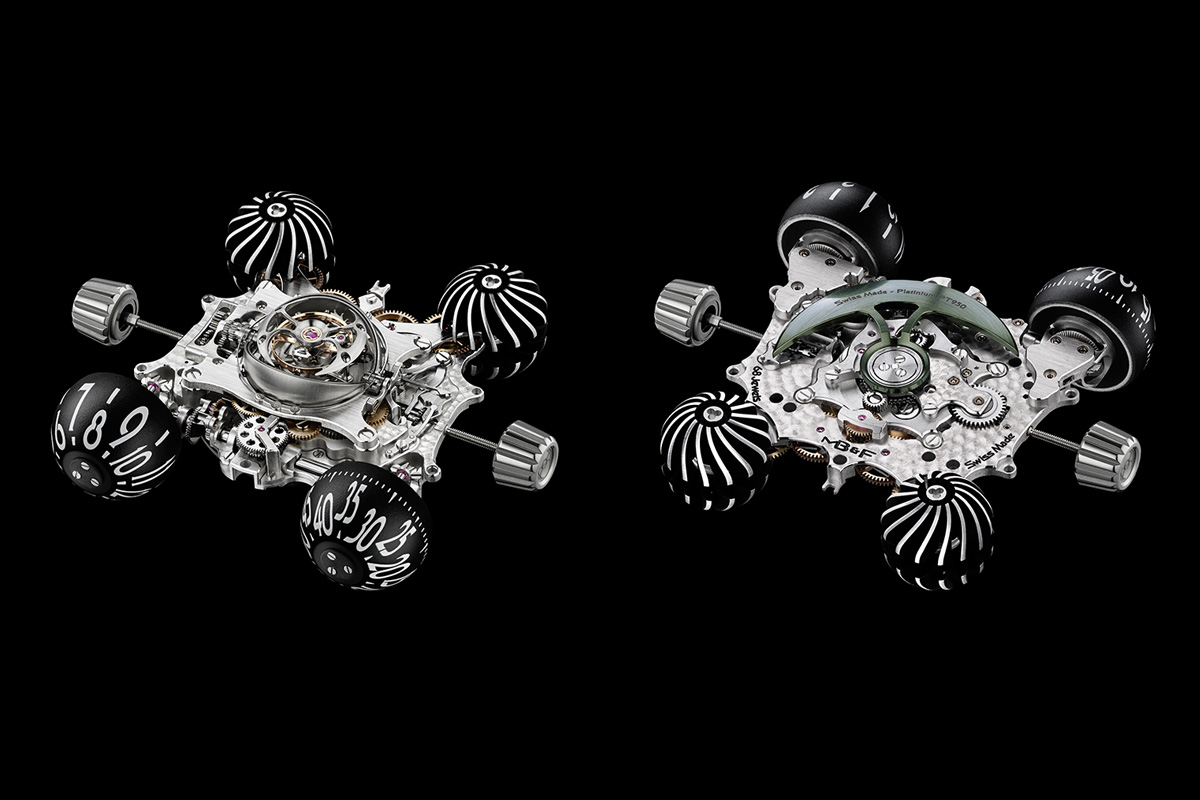 The new MB&F is said to be inspired by the famous 1970s cartoon ‘Captain Future‘ or Captain Flam’ (depending on where the show was broadcasted). Captain Flam had a spaceship called The Comet that consisted of two spheres joined by a connecting tube. Using the idea as a base, the MB&F HM6 uses sapphire spheres linked together by a central ‘tube‘ or ‘fuselage‘. The HM6 has something in common with the HM3 Frog – for the domes – and with the HM4 – for the overall architecture. While the previous watches of Max Büsser were mechanical, this one seems more organic, mixing futuristic codes with vintage, outdated design elements, creating a softer, rounder result.