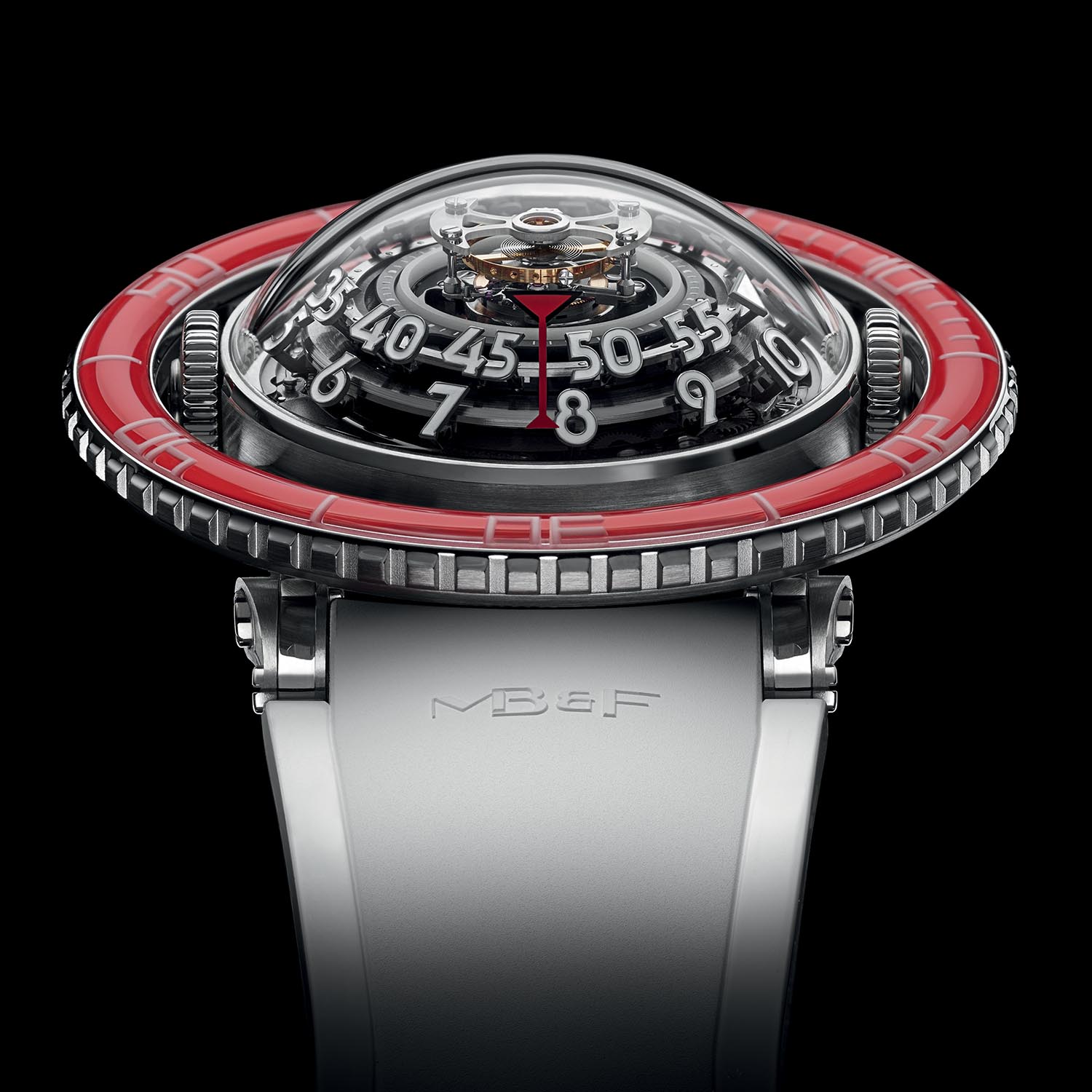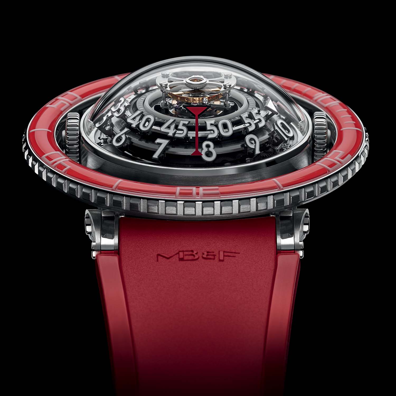 The MB&F HM7 Platinum Red is delivered with 3 rubber strap (red, black, white) moulded in aircraft-grade Fluorocarbon FKM 70 Shore A elastomer – very soft to the touch – with folding buckle in platinum. It will be limited to 25 pieces and priced at CHF 155,000 (Excl. taxes).