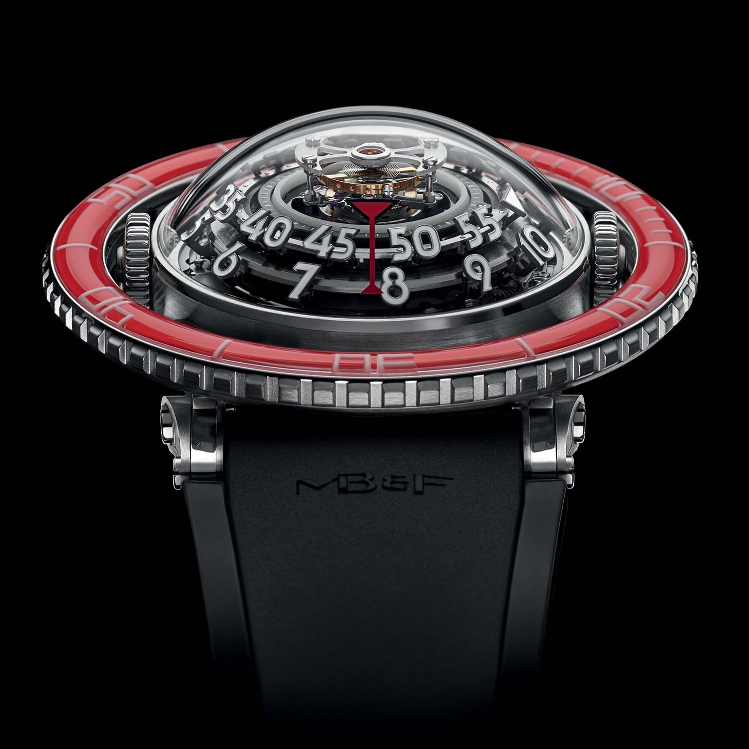 The watch is massive – 53.8mm in diameter, 21.3mm in height – smooth and curved all around and sits on the wrist like nothing else you could have tried before. It’s both a visual and tactile object. The movement, developed and manufactured in-house by MB&F, has a symmetrical conception, with the regulating organ (a one-minute tourbillon) placed on top, right in the centre of the watch, exposed under a highly domed sapphire bubble. Finally, power is brought to the movement by a winding rotor, placed on the other side of this calibre, as a counterweight to the tourbillon on top. The “tentacles” of this rotor are crafted from solid titanium in a complex three-dimensional way.