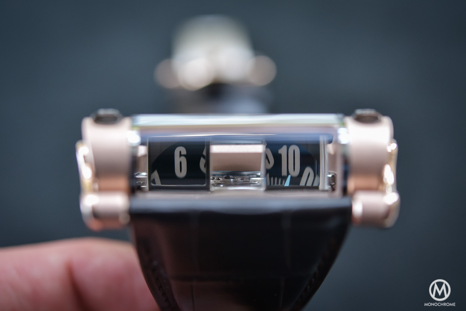The engine of the HM8 looks familiar. Like in the HM5, the time display is digital-mechanical and consists of jumping hours and trailing minutes – with indication inversed, reflected 90° and magnified thanks to two sapphire optical prisms. The most noticeable change is that the base movement has been inverted to show MB&F emblematic battle-axe blue rotor in 22K gold on top. Like before, it is based on a Girard-Perregaux movement, 3000 series. Its finishing is top class but very traditional for such an unusual and creative watch.