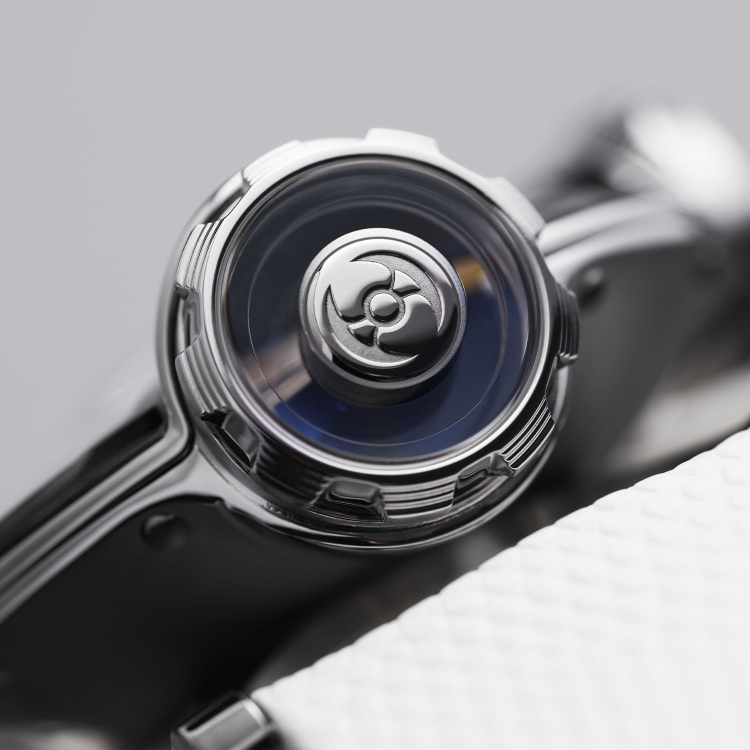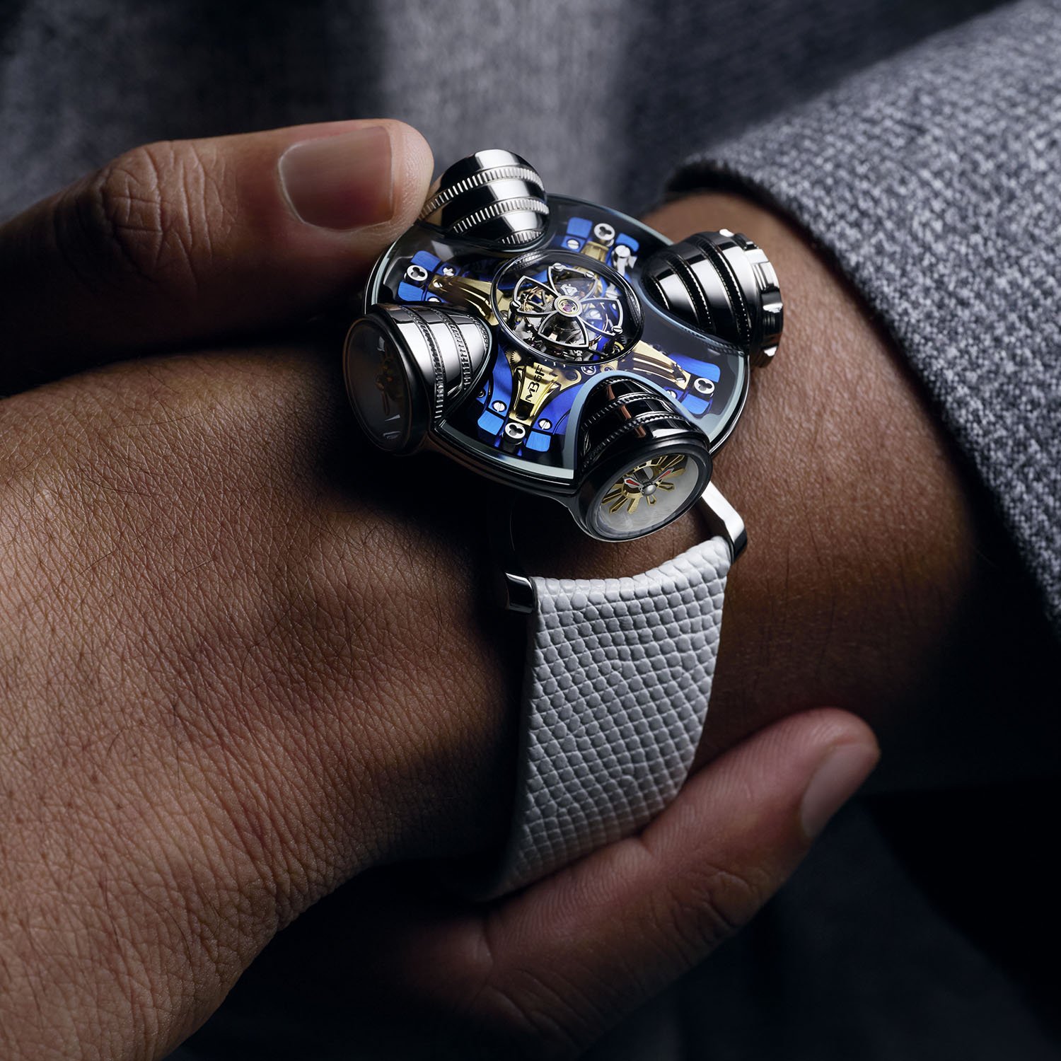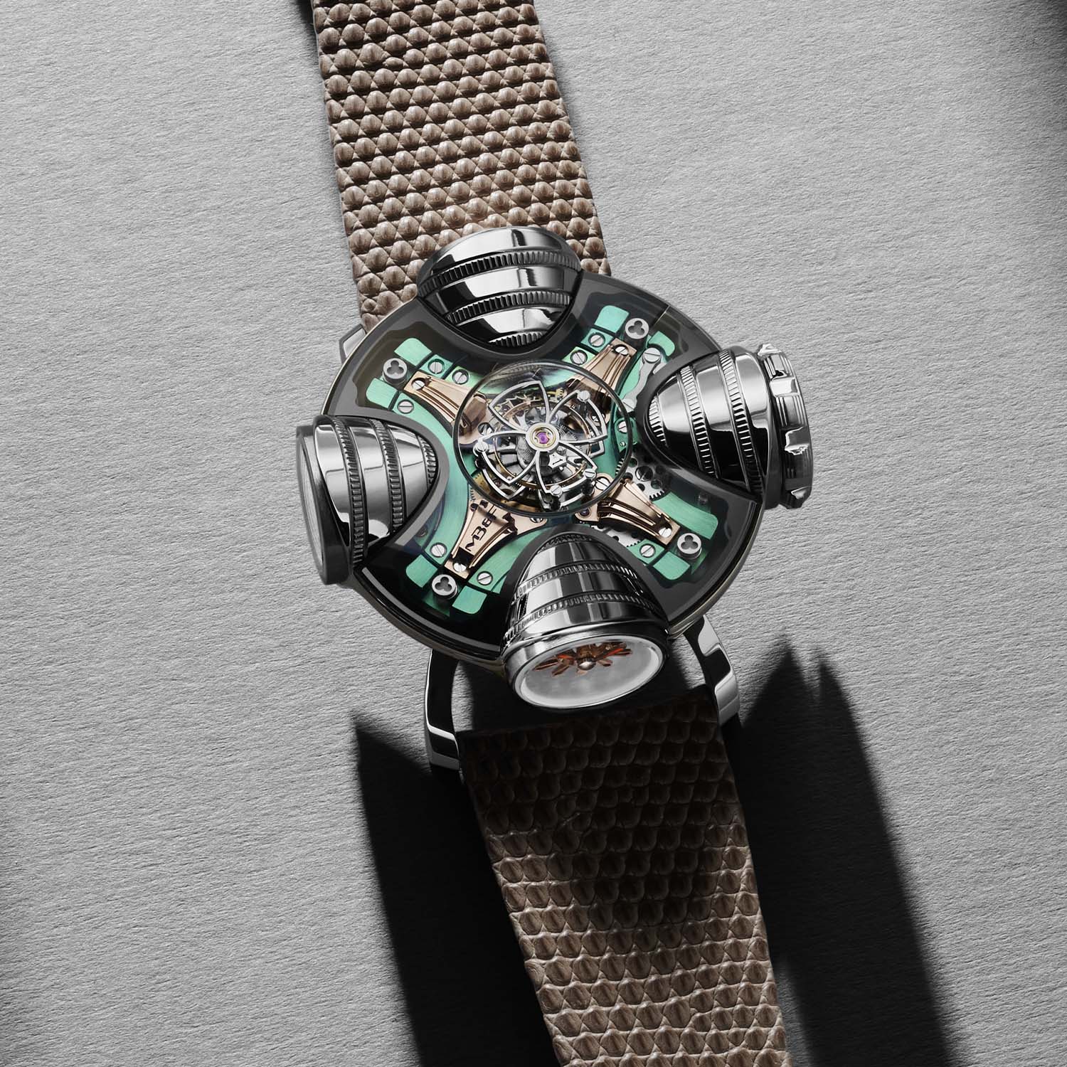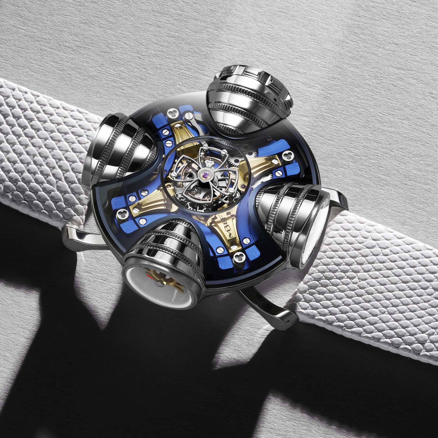 The MB&F HM11 Art Deco is produced in 20 pieces in total, with 10 pieces per colour. The blue dial version is offered on a white lizard strap, and the one with a dial plate comes with a beige lizard strap. The straps are closed with a grade 5 titanium folding buckle. Price is CHF 198,000 (excl. taxes) or EUR 215,000 (excl. taxes).