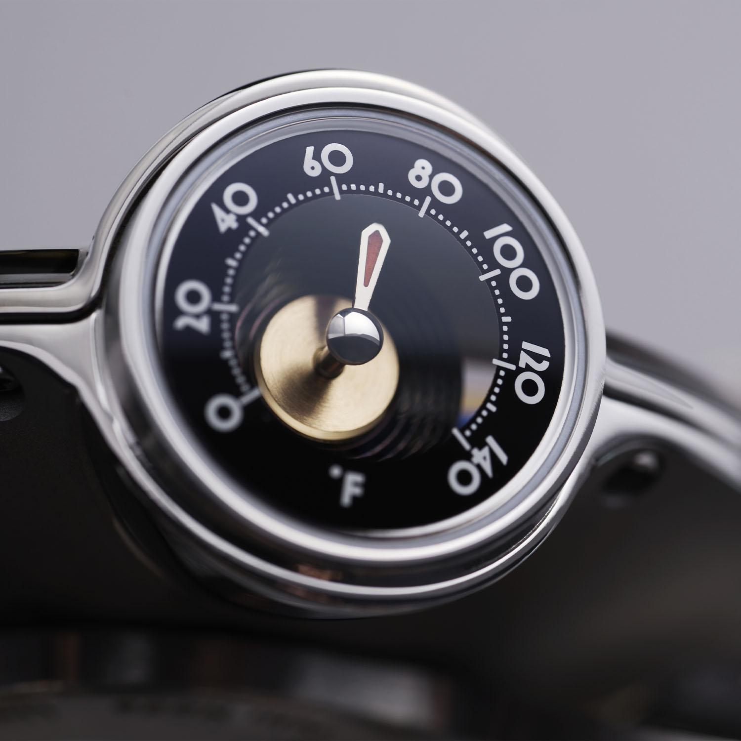 The latest watch in the Horological Machine series by MB&F, the HM11 is a true architectural experiment, but for the wrist: a quatrefoil case composed of four functional rooms surrounding a central atrium that hosts a flying tourbillon. Introduced in 2023 as the HM11 Architect, the concept combined an immediately tactile user ritual with an unusually readable distribution of indications: hours and minutes, power reserve, mechanical thermometer and a time-setting module. The new HM11 Art Deco editions are a stylistic evolution, with the same movement and mechanical logic, re-expressed through the geometric vocabulary of the 1930s. Where the Architect celebrated organic, humanist forms, the Art Deco emphasises verticality, stepped profiles and sunburst graphics.