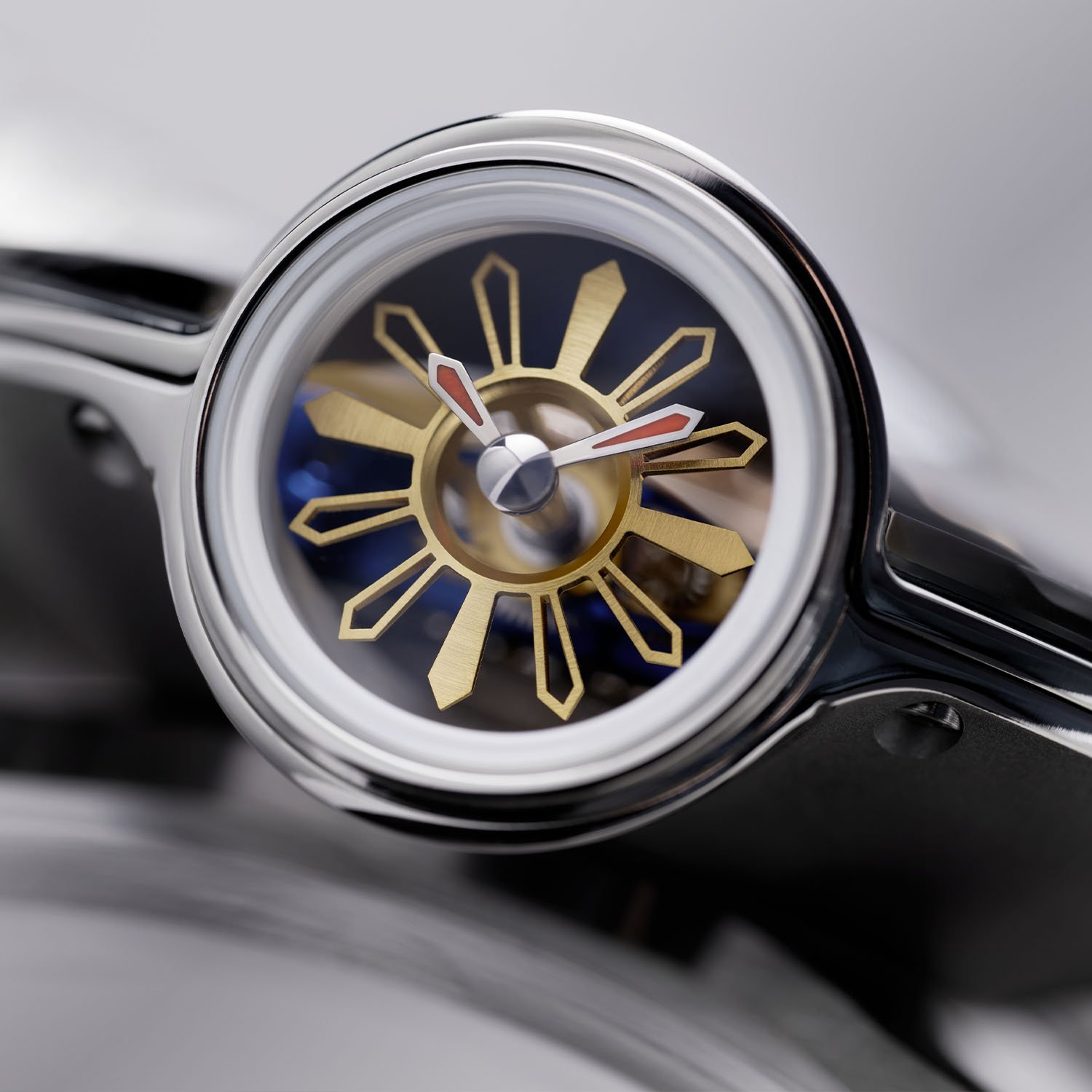 The MB&F HM11 Art Deco replaces the Architect’s conical rods and soft markers with laser-cut sunbeam elements, two-tone rings and period typography. The four pods retain their functions: time (hours/minutes), power reserve, mechanical thermometer (in Celsius or Fahrenheit), and the time-setting module. The central atrium exposes the flying tourbillon; the tourbillon bridge and upper movement architecture have been reshaped into more vertical, arch-like forms to create a coherent axial composition. Hands hold transparent red enamel inserts to create a stained-glass effect. The HM11 Art Deco is available in two editions: one with a blue dial plate and 3N yellow-gold-toned bridges, while the other has a green dial plate and 5N rose-gold-toned bridges.