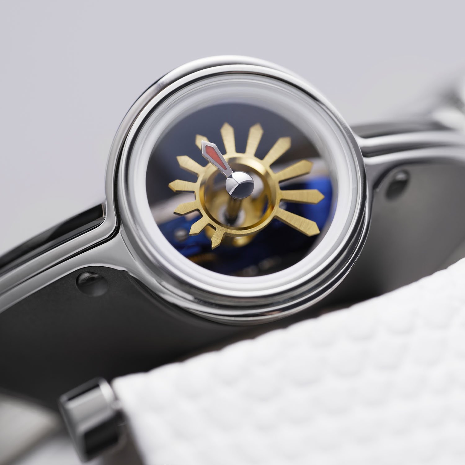 Mechanically, the Art Deco edition is identical to the HM11 Architect: an in-house, three-dimensional manual movement built around bevel gears, with a flying tourbillon beating at 18,000 vibrations/hour and a 96-hour power reserve. The movement is mounted on a suspension system formed by four laser-cut high-tension springs, decoupling the engine from shocks. Winding remains user-centric, performed by rotating the case rather than using a conventional crown, and the movement architecture is executed and finished to MB&F standards: multi-layer bridges, hand chamfering and mirror polishing across visible surfaces.
