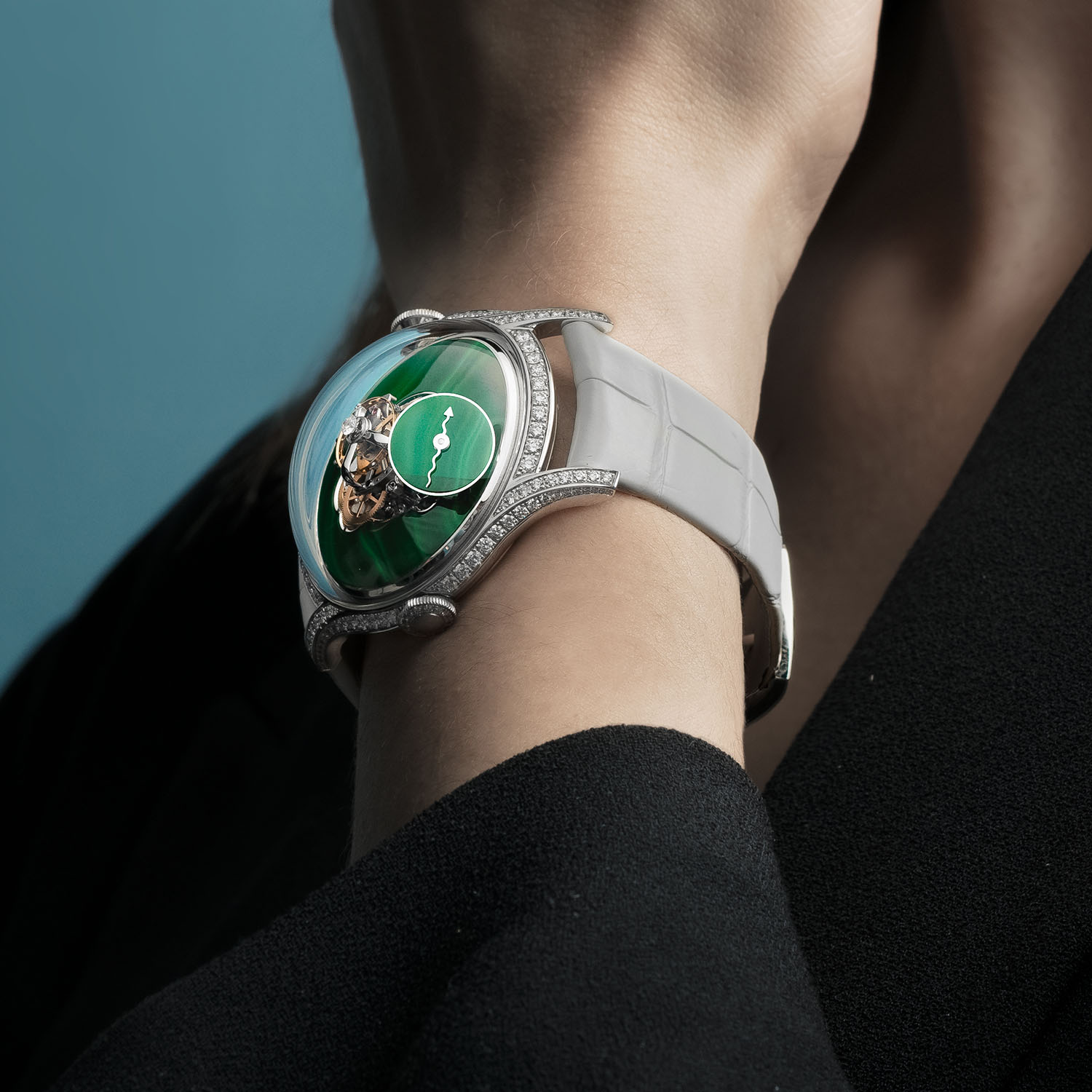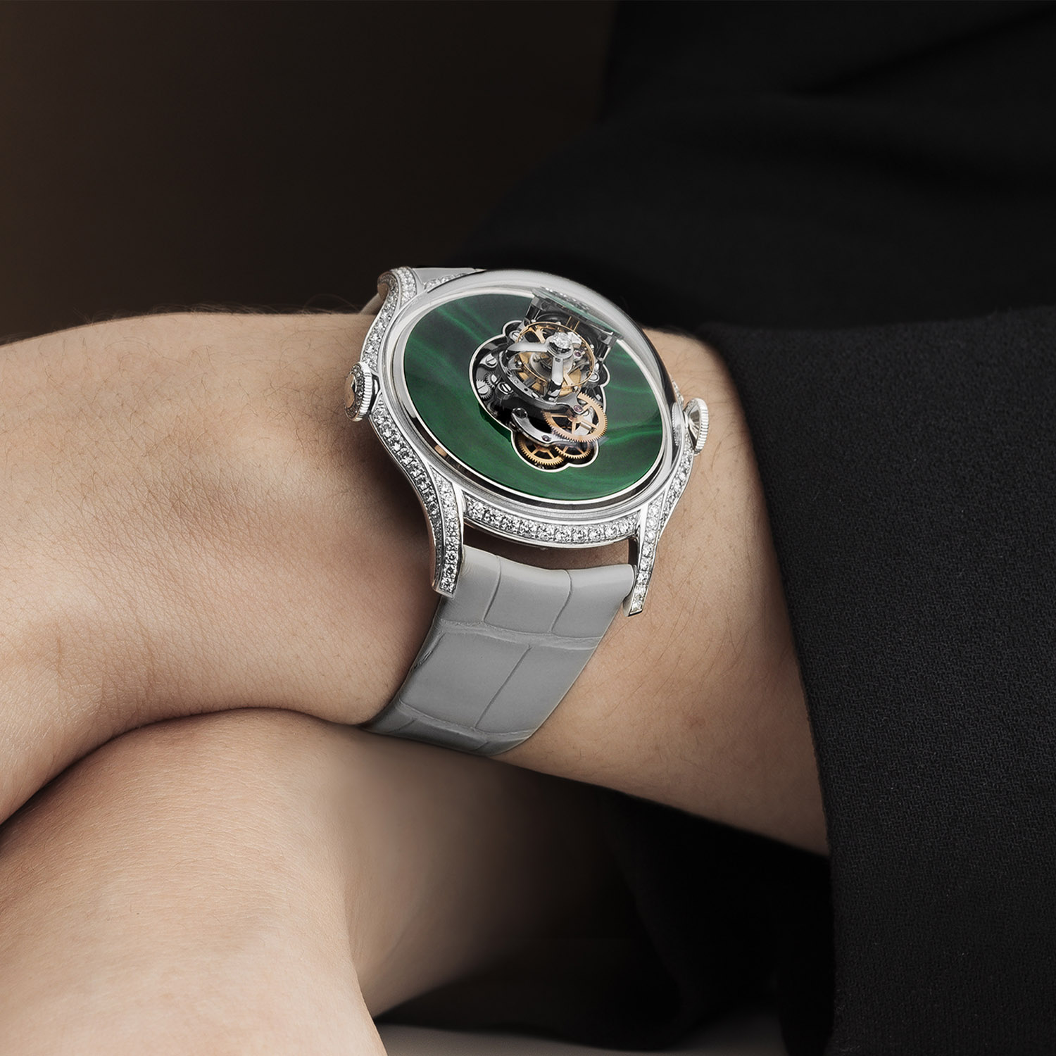 After fourteen years of conceiving highly imaginative, complex watches for men, Max Büsser was ready to venture into feminine territory. In 2019, MB&F launched the Legacy Machine FlyingT, the brand’s first women’s watch. With its 3D staging, spectacular elevated flying tourbillon and a protuberant domed showcase, the LM FlyingT was a winning combination of micro-mechanical delights and elegant, feminine touches. Warmly received by women who enjoy mechanical watches, the watch took home the Ladies’ Complication Prize at the GPHG awards that same year. Now in its seventh edition, for 2021, the FlyingT is back with an intense green malachite dial.