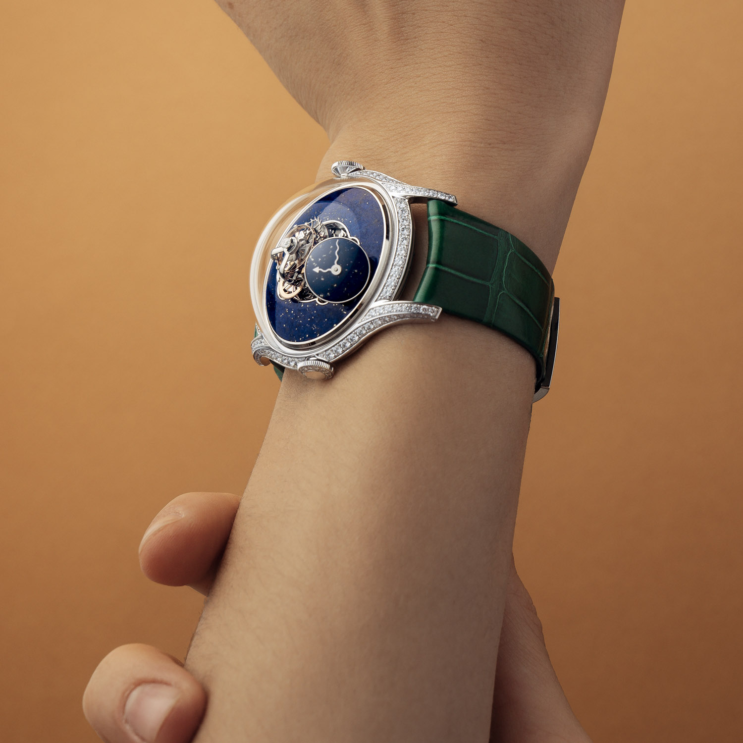 The dial is dominated by the large asymmetric ‘ventricular’ aperture in the centre bearing the spectacular flying tourbillon crowned with a diamond. Unlike most flying tourbillons that need to be anchored firmly at their base and are placed deep inside the movement, the FlyingT sits on top of a column construction and rises vertically to perform its one-minute rotations. The lapis lazuli hours and minutes counter (no numerals) is placed at 7 o’clock and features serpentine hands. However, what is most striking about this feature is the inclination of the counter at a 50° angle so that only the wearer can consult the time.