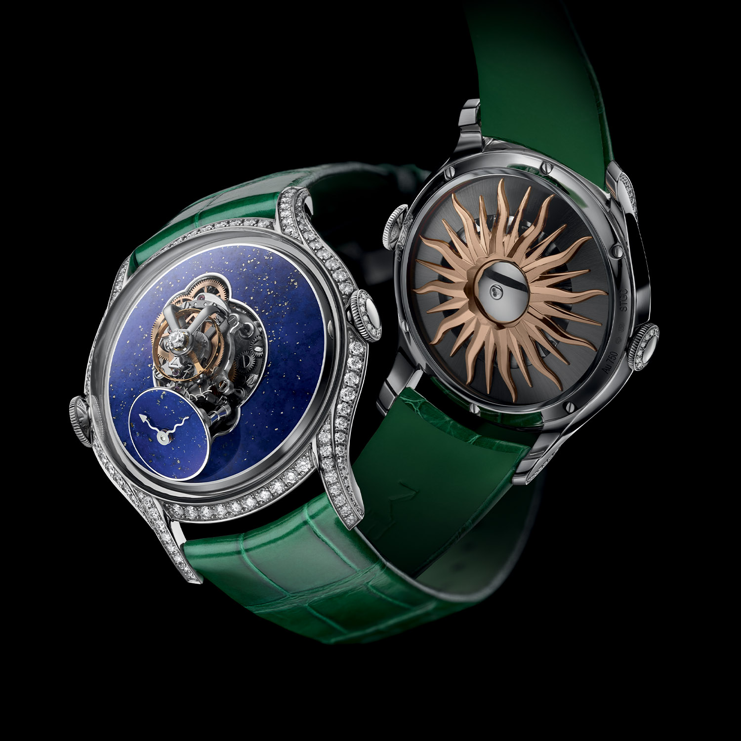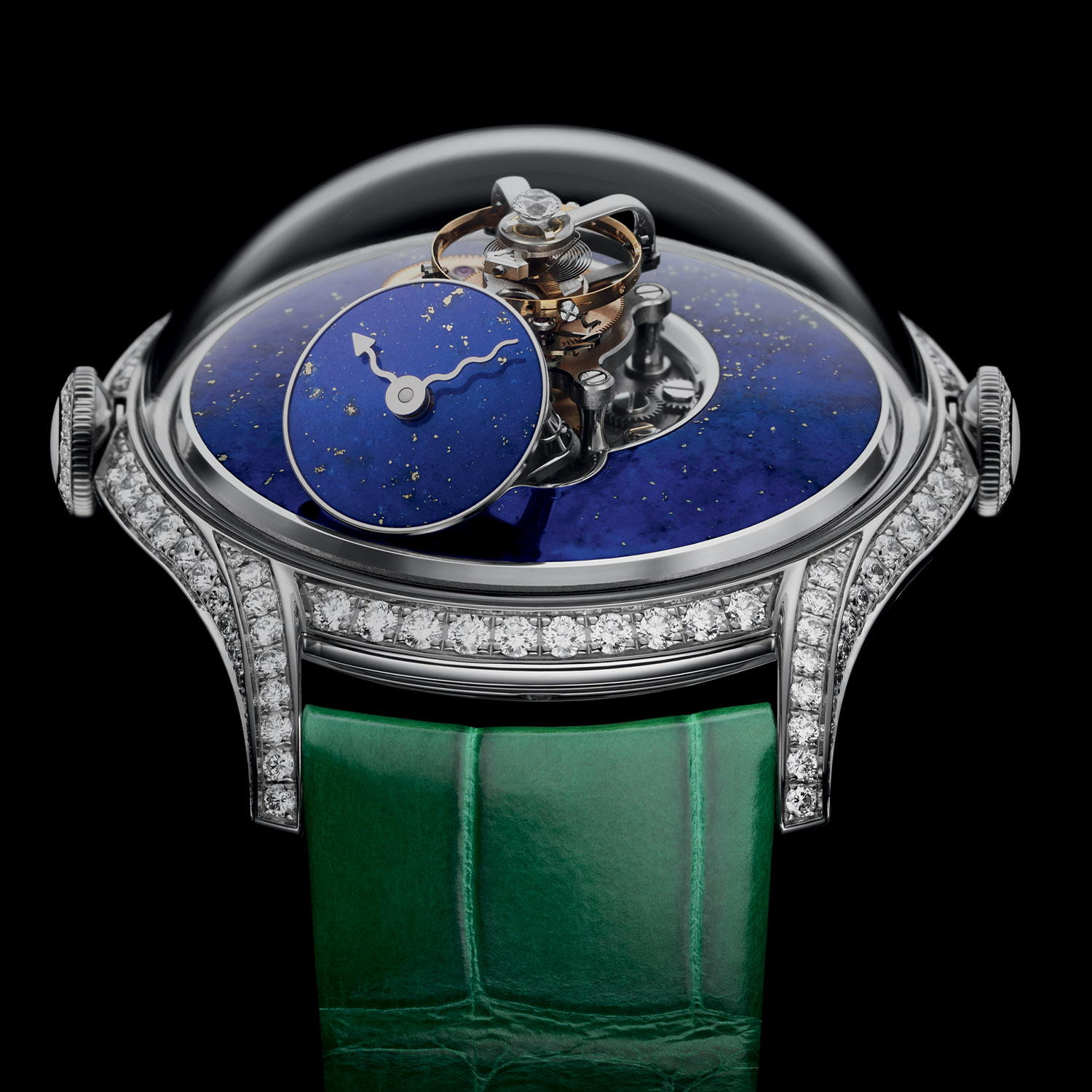 MB&F’s maiden voyage into the galaxy of women’s watches was a resounding success. After years of masterminding complex, visually arresting watches for men, Max Büsser presented the Legacy Machine FlyingT in 2019. Still very much a child of MB&F, with its 3D staging, flying tourbillon and protuberant domed showcase, the LM FlyingT was a winning combination of micro-mechanical delights and elegant, feminine touches. Not only was it warmly welcomed by women who enjoy mechanical watches, the watch took home the Ladies’ Complication Prize at the Grand Prix d’Horlogerie de Genève that same year. Closing the year in style, MB&F proposes its sixth edition of the LM FlyingT, this time with a vivid blue lapis lazuli dial and a generous sprinkling of diamonds.