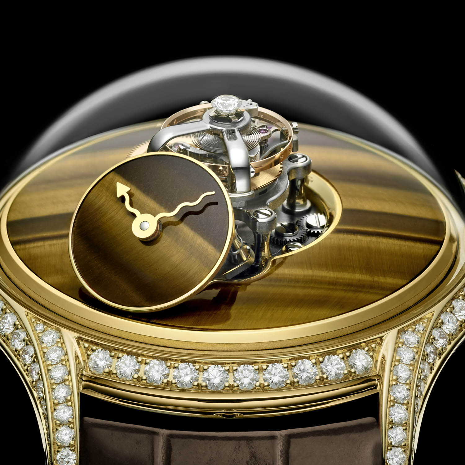 The launch of the Legacy Machine FlyingT in 2019 was something of a space oddity in the brand’s trajectory, marking the first MB&F watch designed for women. True to Max Büsser’s mission of creating complex kinetic timepieces, the ladies’ LM FlyingT features a flying tourbillon rising dramatically above the dial plate, an intriguing dial perched at an angle and a prominent sapphire crystal dome. Enthusiastically received by women (and men too) and awarded the Ladies’ Complication prize at the 2019 edition of the Grand Prix d’Horlogerie de Genève, MB&F launches another version of the Legacy Machine FlyingT this time with a beguiling Tiger’s Eye plate and dial in an 18k yellow gold case set with diamonds.