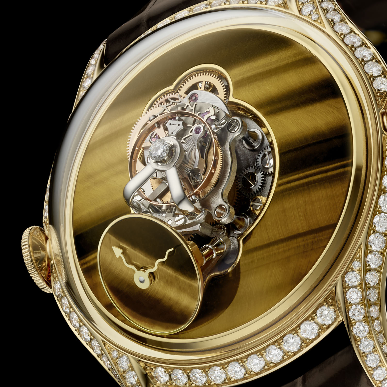 Rising from the asymmetric opening carved into the Tiger’s Eye dial plate, the flying tourbillon is held in place by a diamond and performs its rotations at a serene 2.5Hz rate. Like the other malachite and lapis lazuli gemstone versions, the inclined dial for the hours and minutes has no numerals but features the signature serpentine hands. Matching the case material, the ventricular aperture and the dial are framed in yellow gold.