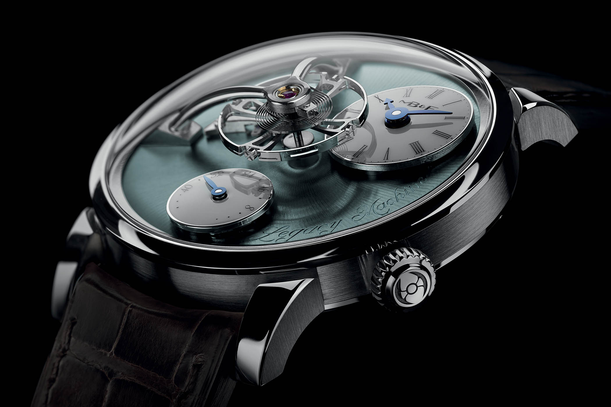 With the LM101, the smaller-sized Legacy Machine (with a 40mm diameter), this captivating spectacle was orchestrated by the brand’s first in-house movement. Plus, its large 14mm balance wheel beats at 18,000 vibrations per hour, a perfect pace to enjoy its aerial motion. A limited-edition of 18 pieces, the latest iteration, the MB&F LM101 Palladium, is the brand’s first palladium watch (and one of the rare watches in the industry with a case in this material). This rare metal is part of the platinum group, alongside rhodium and ruthenium. It is naturally white and does not require plating. Its subtle tone contrasts beautifully with the sunray dial, whose colour varies between grey and shades of pale blue and green depending on the light.
