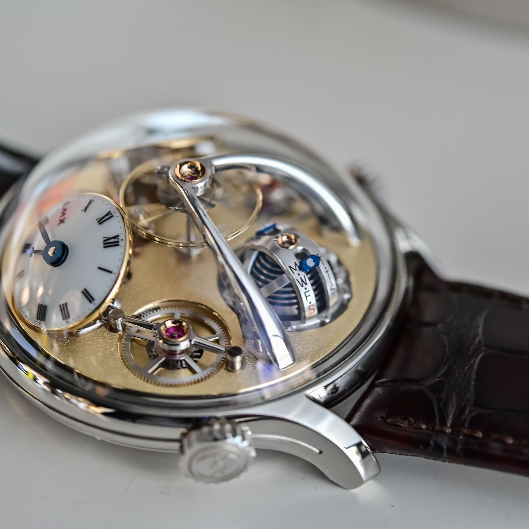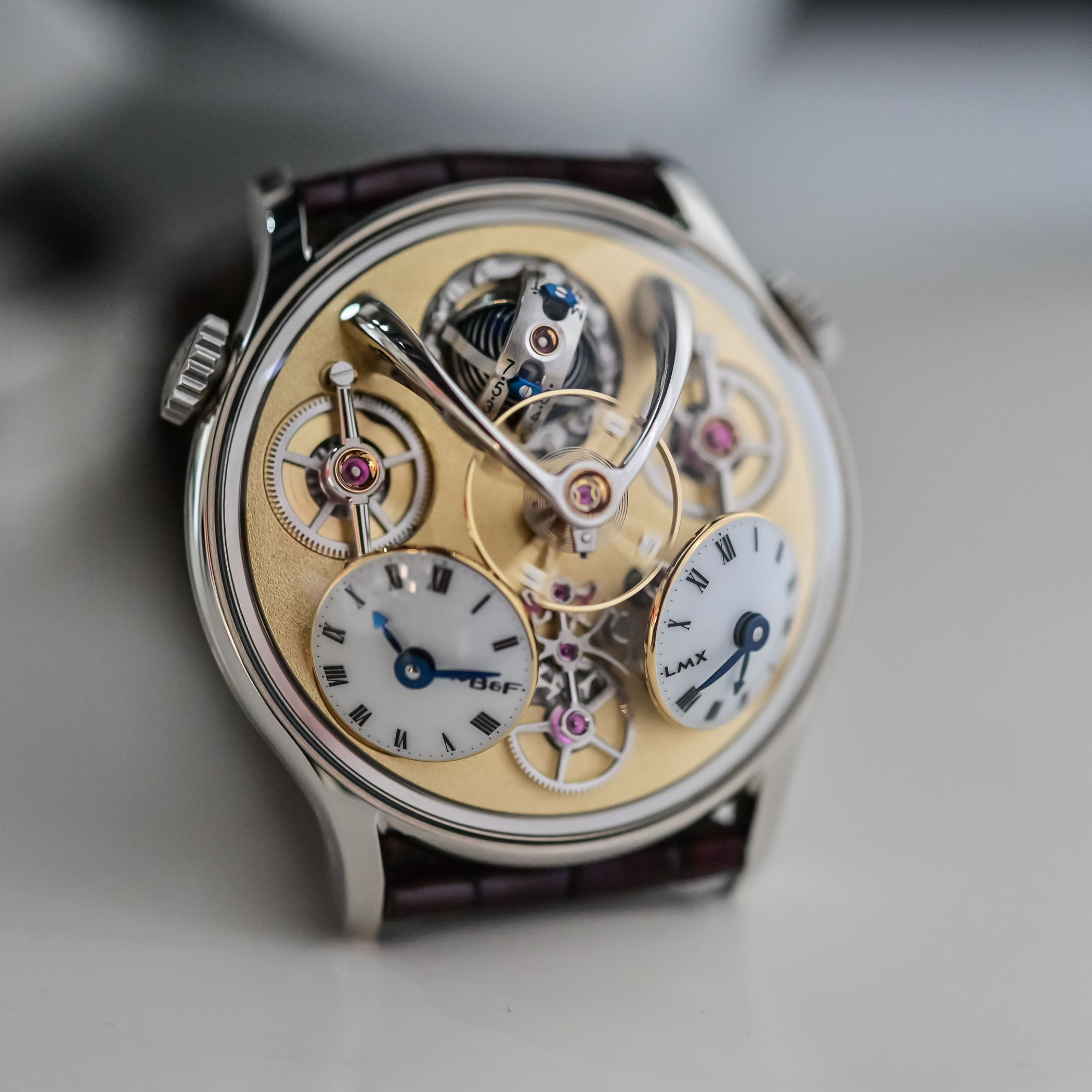 Echoing the crowns at 10 and 2 o’clock on the case, the dial features two horizontally arranged wheels placed above the two titled sub-dials that rotate when the time is adjusted on either dial.