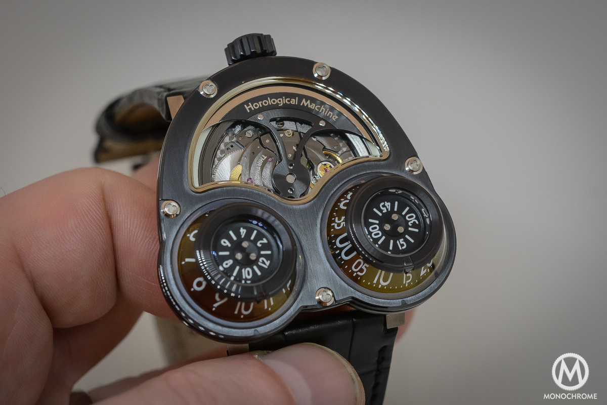The HM3 was a huge success for MB&F and was the perfect watch to create the most crazy editions possible, like the Jwlry Machine and its unique gem setting, the HM3 Frog, the Moonmachine made with Sarpaneva or the Megawind. Every good story however has an end and MB&F chose to close the book with a final edition of the HM3 based on the Megawind, the one that comes with an oversized rotor and spaceship-like time indicators.