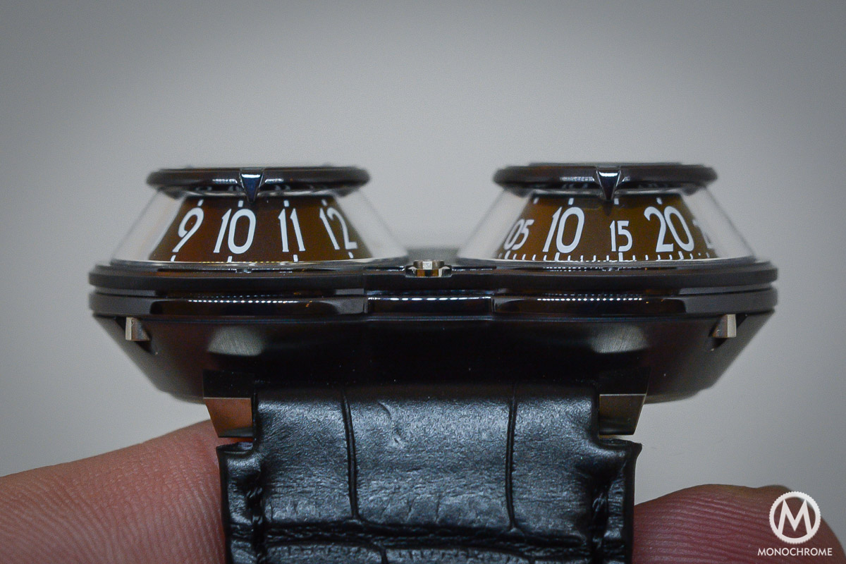 The 3D cones on the top are rotating and indicate on the left the hours and on the right the minutes. They can be read from both the side or the top. The MB&F HM3 Megawind Final Edition is like every HM3 a quite massive watch that wears surprisingly well. The case measures 47mm x 50mm x 17mm but the short and curved lugs helps to balance the watch on the wrist. Not the most discreet timepiece available, it however remains one the coolest.