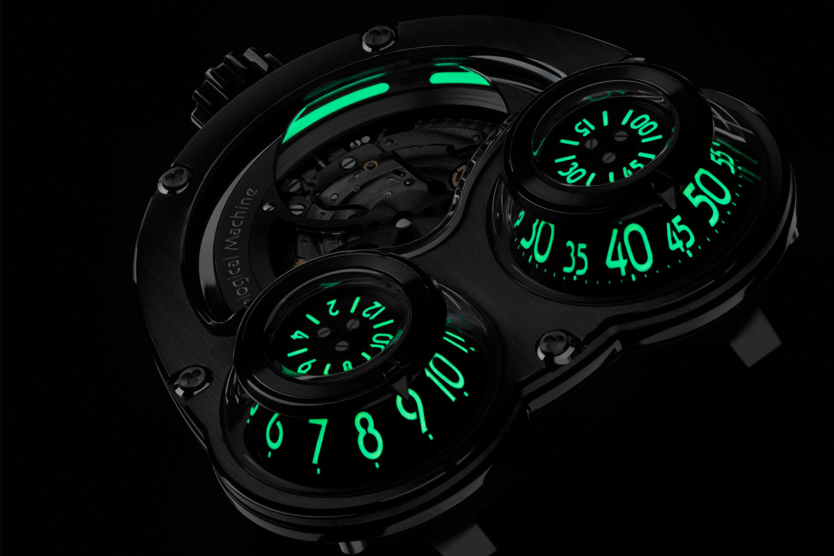 If the MB&F HM3 Megawind Final Edition is already a very cool watch in day light, it also has to be appreciated during the night. It comes with the strongest luminous coating available (the Super-LumiNova GL C3 Grade A to be precise) on both the cones (helpful to read the time) and beneath the rotor. When it’s dark, a thick line of Super-LumiNova is alternately revealed and covered by the turning rotor, adding animated bright flashes from the glowing green lume to the glowing indications.
