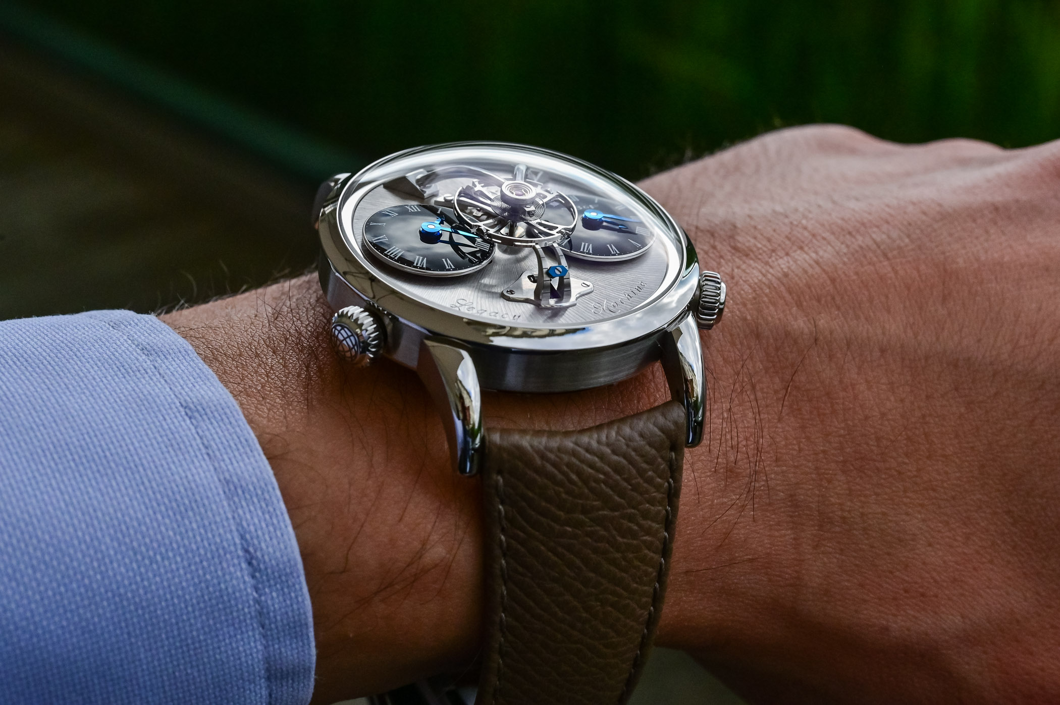 Like earlier editions of the Legacy Machine 1, the case, with its 44m diameter and 16mm height, has two crowns to set the independent time zones displayed on the two black sub-dials with white Roman numerals. The original vertical power display is positioned at 6 o’clock, and in pride of place is the monumental 14mm balance wheel beating at 18,000vph suspended above the dial.