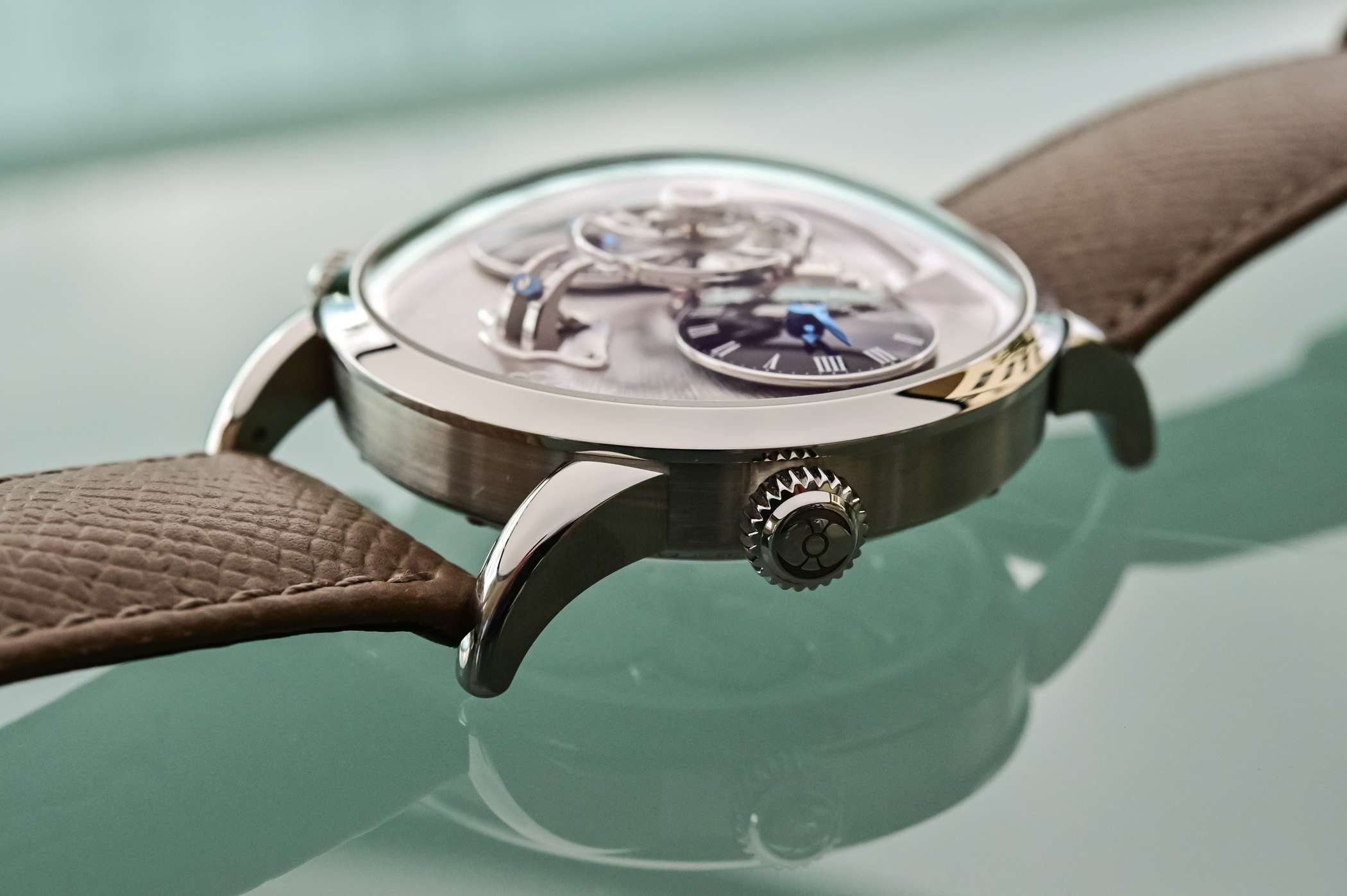 Having recovered the original concept of long, curved lugs – a unique feature not found on any other LM1 watch – there are a couple of other attributes that make this prototype truly unique. While most LM1s were produced in gold, platinum and titanium, the LM1 Longhorn is made of stainless steel, like the LM1 Final Editions of 2017. The base plate is rhodium-plated, and for the first time in the LM1’s history, the glossy white lacquer of the sub-dials has been replaced with a shiny black lacquer that contrasts exceptionally well with the blued hands. The arched bridge spanning the flying balance wheel corresponds to the latest, more organic version of the bridge also found on the Final Edition models.