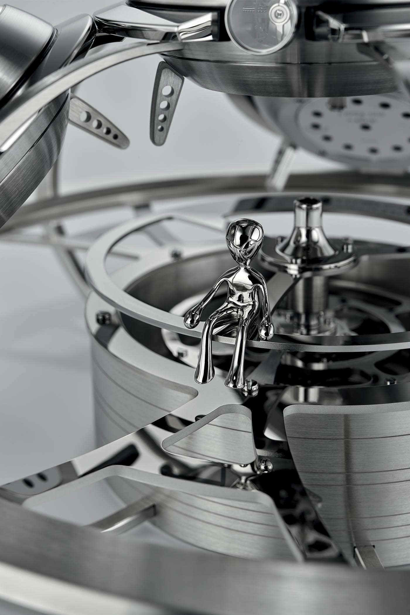 Finally, there’s the last element – the fifth element indeed, or mothership to receive all 4 other elements. Several structures and shapes were tried and tested, including a vertical configuration, before the final form was validated. The final result is a framework milled from solid blocks of brass, which isn’t just a fixed part of this unique creation. Included in this mothership is a second, independent clockwork mechanism supported on bearings in the base and activated by a pushbutton. This starts Ross, the signature alien pilot found on various MB&F creations, who is slowly rotating around the mothership “as though constantly scanning the skies for both inclement weather and hostile invaders”.