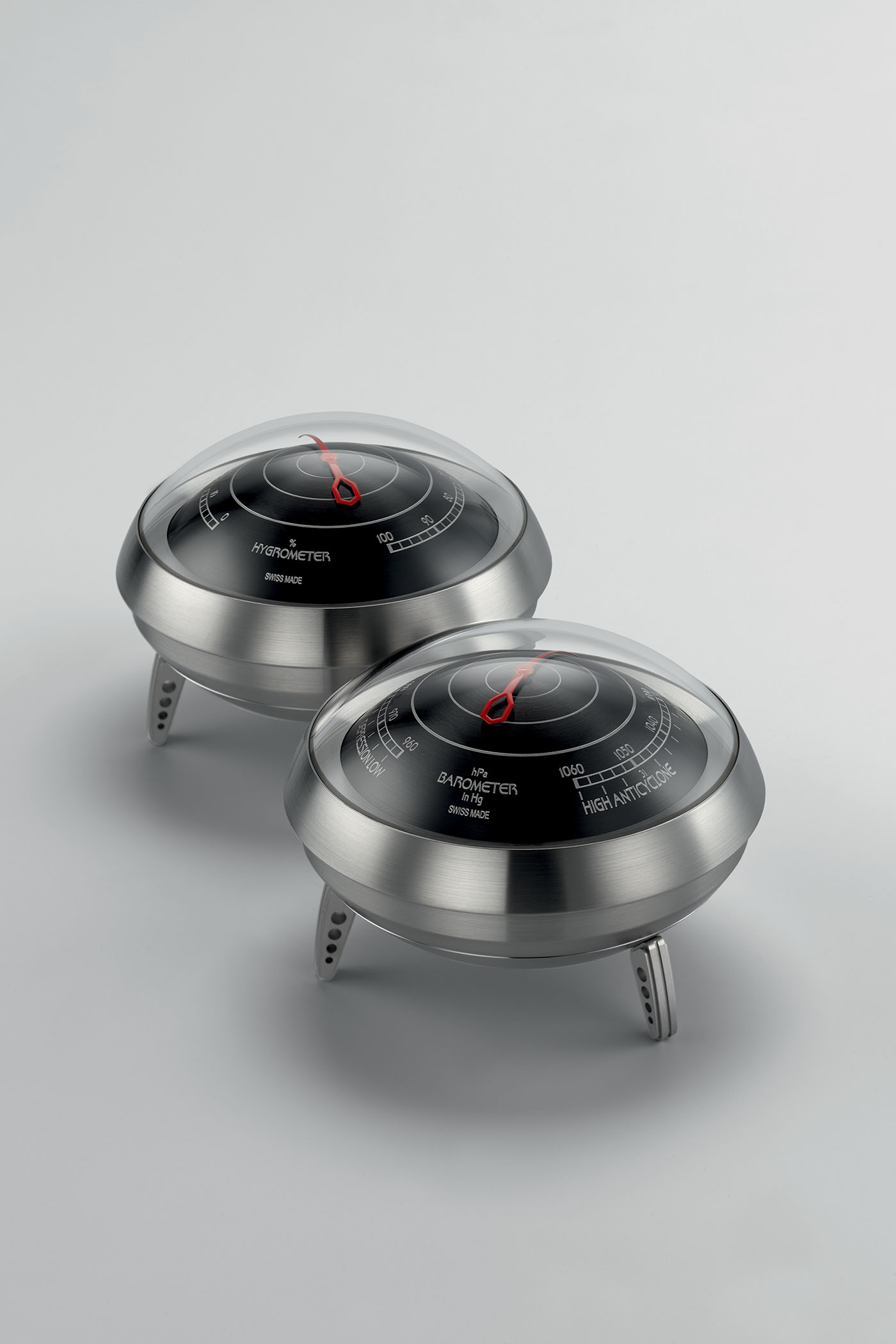 The Fifth Element comprises 4 removable and interchangeable instrument Elements, each of them displaying a specific indication – related to the time or the weather. All of them are shaped like space pods, protected by a highly domed glass display. All of them can be used independently, placed separately on a table or onto the framework. All of them can be placed anywhere on the framework. And all of them are working independently from the other.