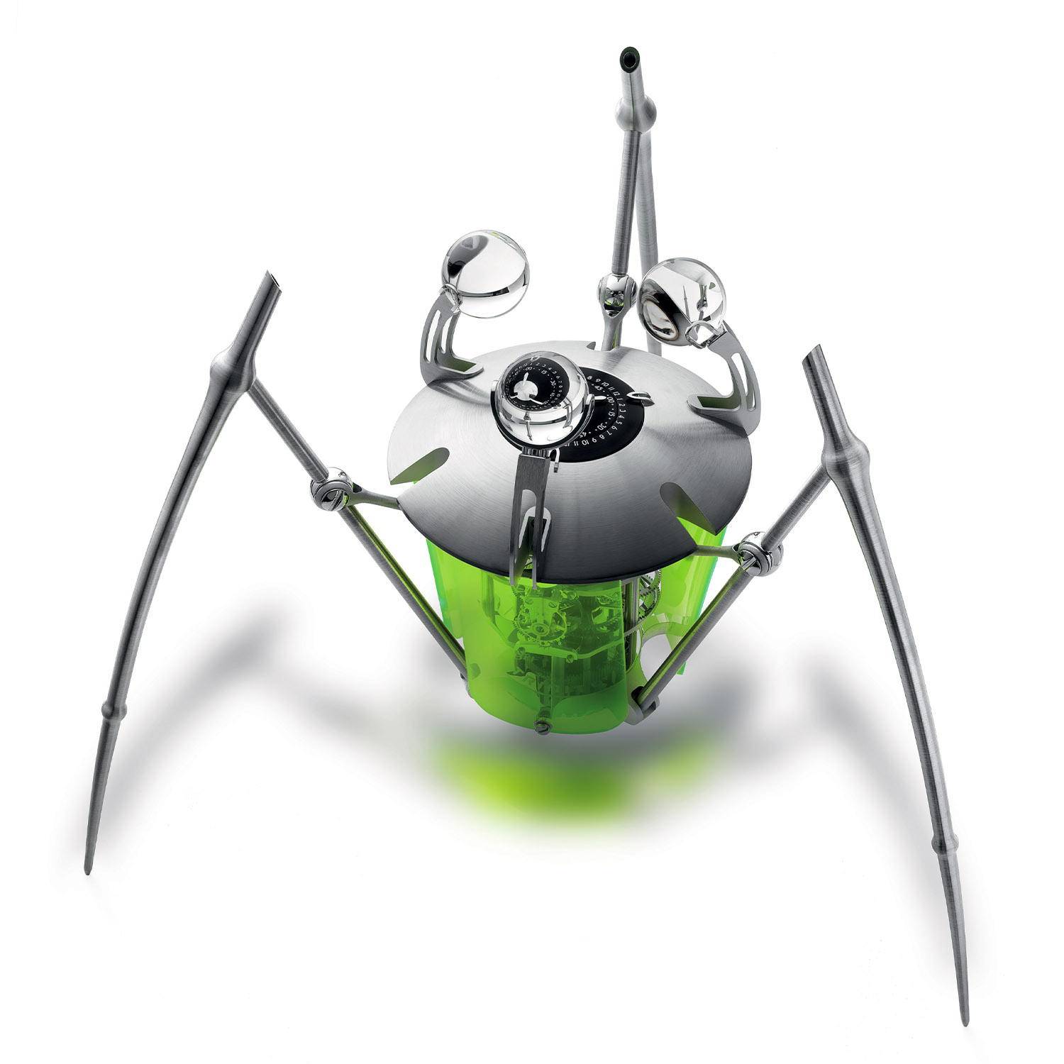 The three legs support a central cylinder containing the heart of the Robocreature. The movement is shielded with a translucent acrylic canister in neon blue, neon green or neon red. Three bug eyes made of precision lens-quality glass are placed on the upper deck and peer over the two concentric rotating time discs to reveal the time from three different positions. According to Arnaud Nicolas, CEO of L’Epée 1839, the mineral glass spheres were one of the greatest challenges in the process. The spheres had to be placed at an optimal distance and had to have an optimal size; large enough to amplify the time but not too large to disrupt the design.