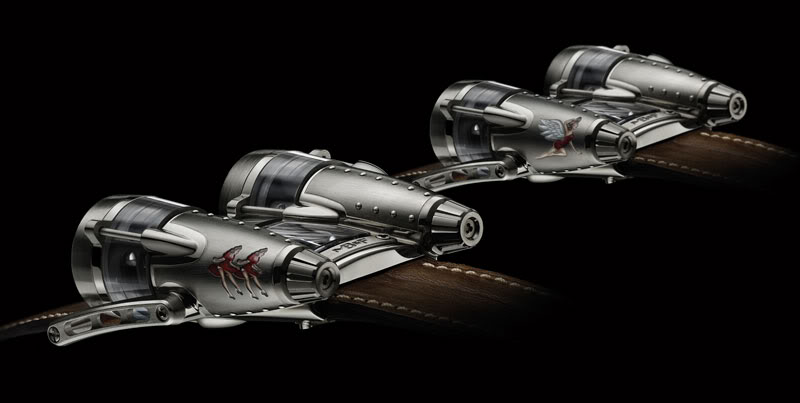 Razzle Dazzle and Double Trouble are perhaps the most logical limited edition that MB&F ever made with their Horological Machines. While the HM4 Thunderbolt already has the looks of a mid-1900’s fighter airplane, the limited edition for Only Watch 2011 only made that idea stronger. The hand-painted and riveted ‘jet-engines’ of HM-4 remind us of WWII aircrafts.