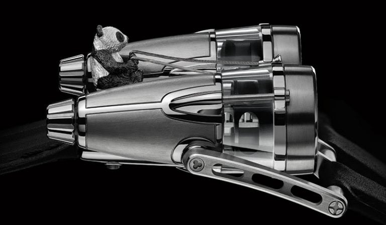Razzle Dazzle and Double Trouble are perhaps the most logical limited edition that MB&F ever made with their Horological Machines. While the HM4 Thunderbolt already has the looks of a mid-1900’s fighter airplane, the limited edition for Only Watch 2011 only made that idea stronger. The hand-painted and riveted ‘jet-engines’ of HM-4 remind us of WWII aircrafts.