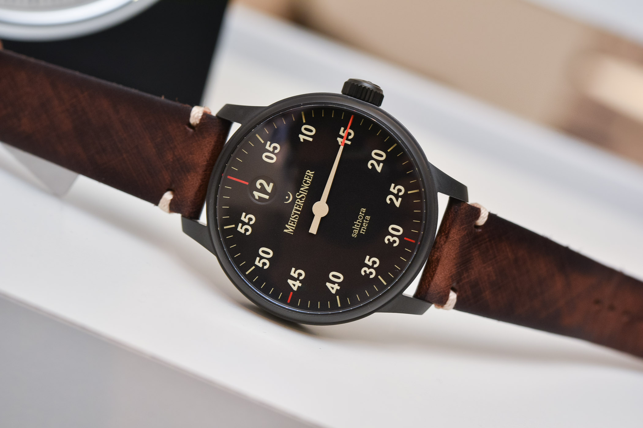 Don’t be fooled by the numeral 12 shown on top of the dial of this watch… It isn’t an hour marker. It is a much more interesting feature! Indeed, the Salthora Meta combines the single hand indication with a jumping hour displayed in a round window at 12 o’clock. Thus, for once, the single hand of this MeisterSinger serves as an indication of the minutes. A different take on the base concept that actually makes the Salthora Meta the most convenient and possibly one of the coolest watches in the collection.
