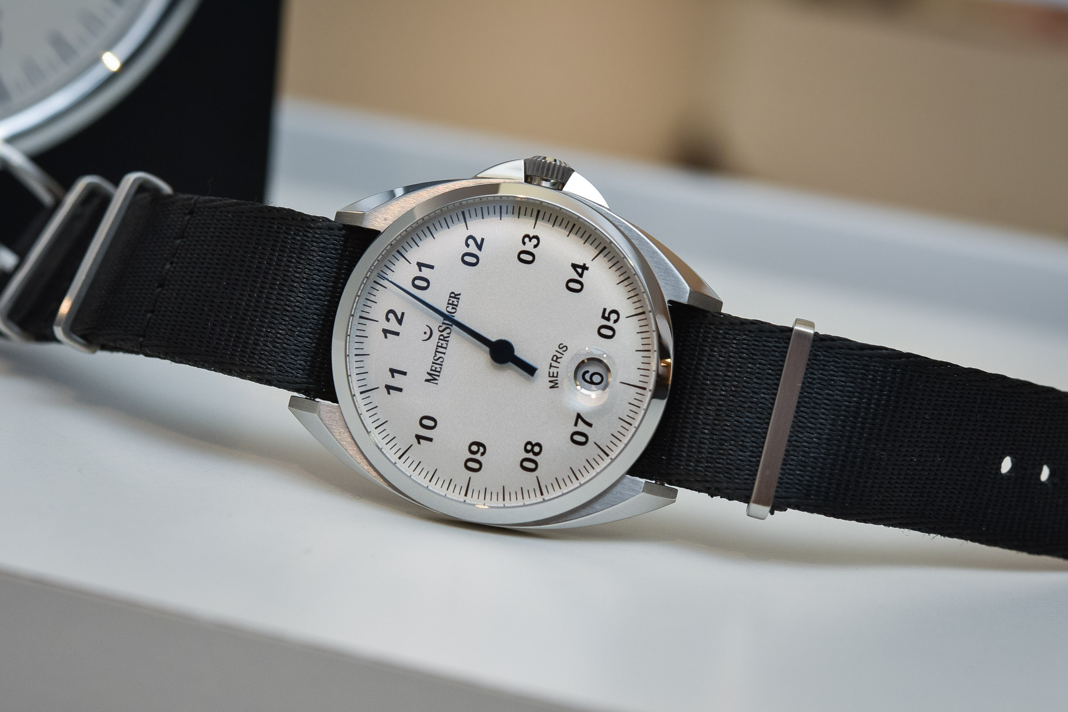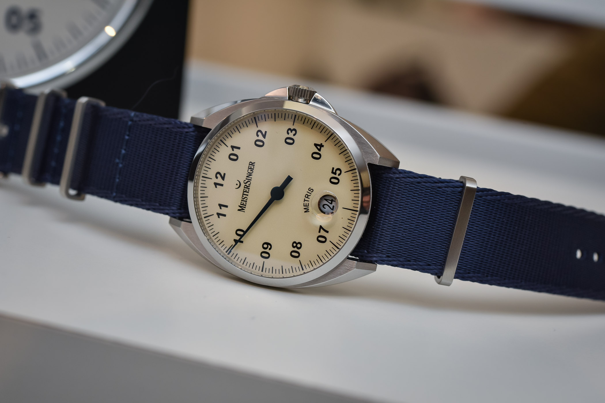 The dial of the Meistersinger Metris collection comes in four variations, but all of them feature a white date wheel. You can choose from an opaline silver, ivory, black or dark blue dial, and all the models come with a beautifully crafted textile NATO-style strap. Each dial comes with a contrasting set of hands and markers. The black dial Metris for instance, has a black central hand, white markers and text, and a red-on-white date wheel. Double-digit hour markers and the central needle-point hour hand are typical Meistersinger themes, which are present in the new line-up too.