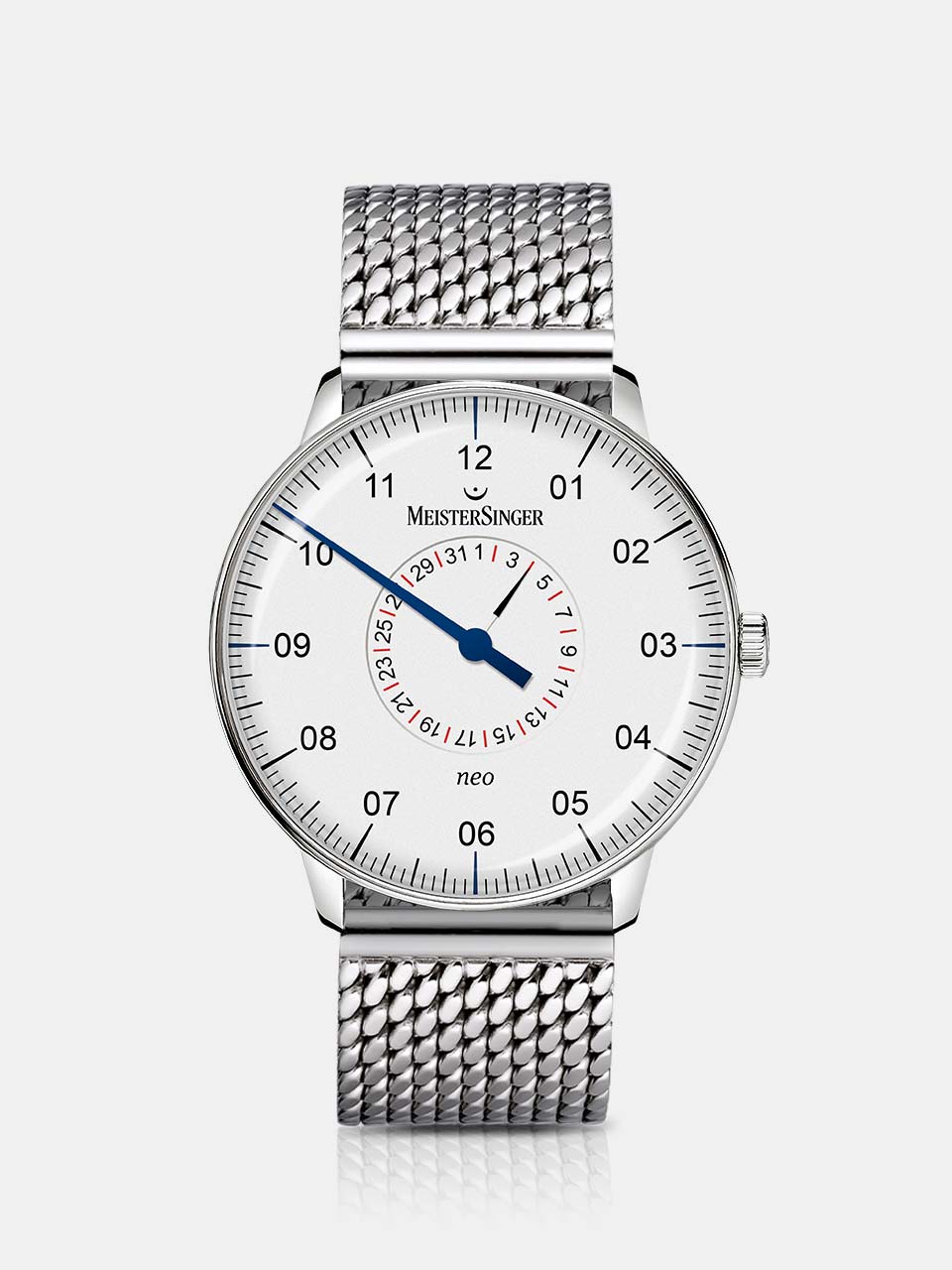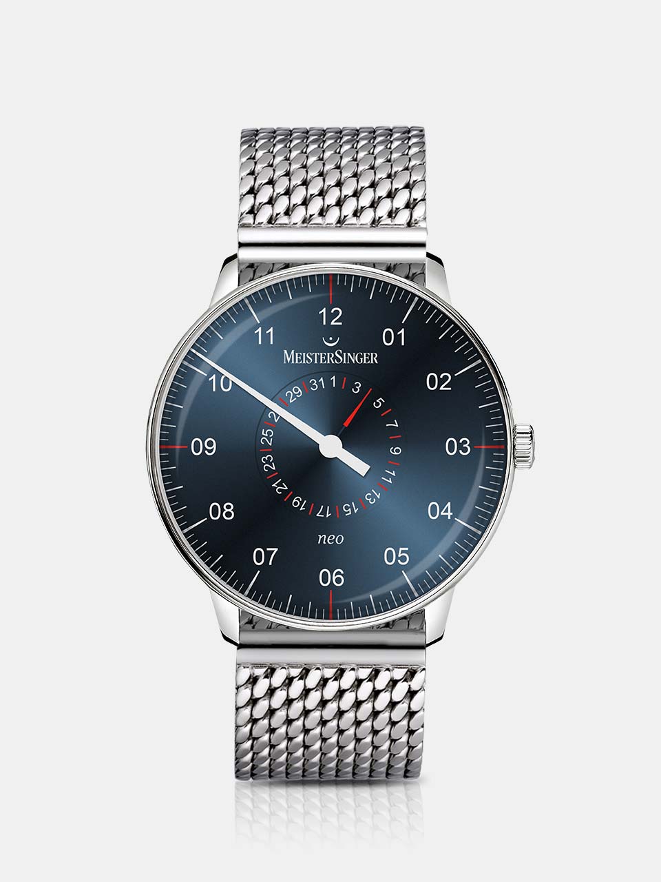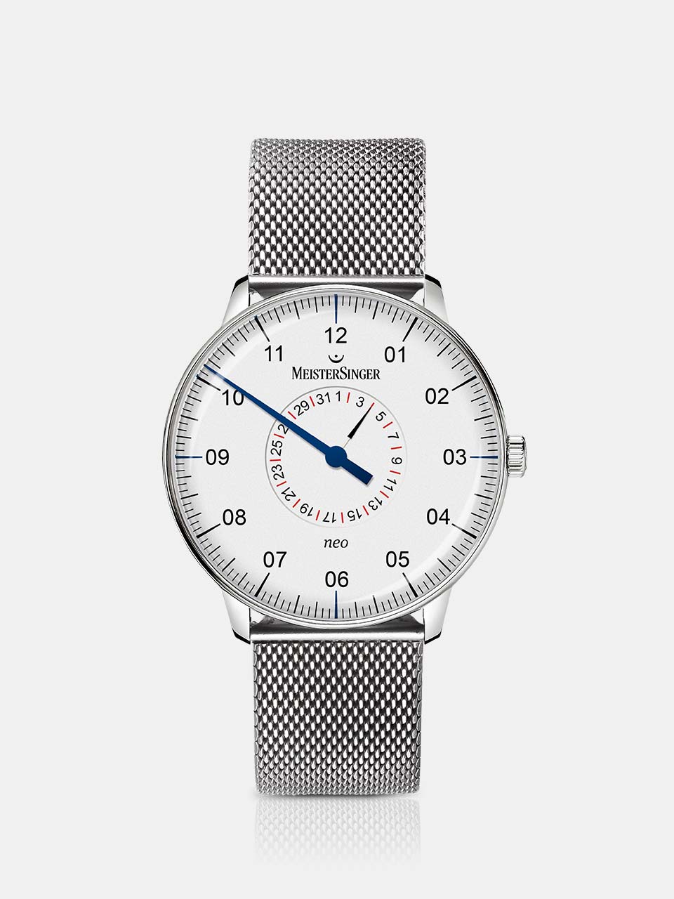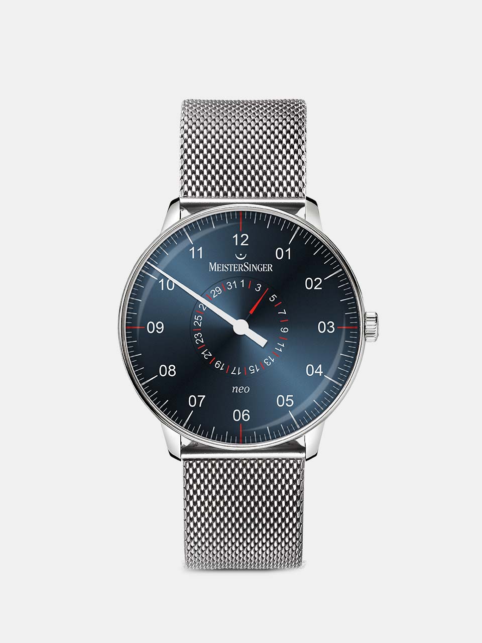 Available in 36mm (Neo Pointer Date) and 40mm (Neo Plus Pointer Date) stainless steel cases and with a sunburst blue or a white opaline dial, the Neo Pointer Date has managed to incorporate a second hand without betraying its ‘single hand, slow time’ philosophy. Also in keeping with the brand’s philosophy of restrained prices, both models are equipped with outsourced Swiss movements, in this case an automatic Sellita SW 200-1 with a 38-hour power reserve. The caseback is screwed and the dial protected with hardened Acrylic glass. A handsome mesh Milanese steel bracelet accompanies both models.