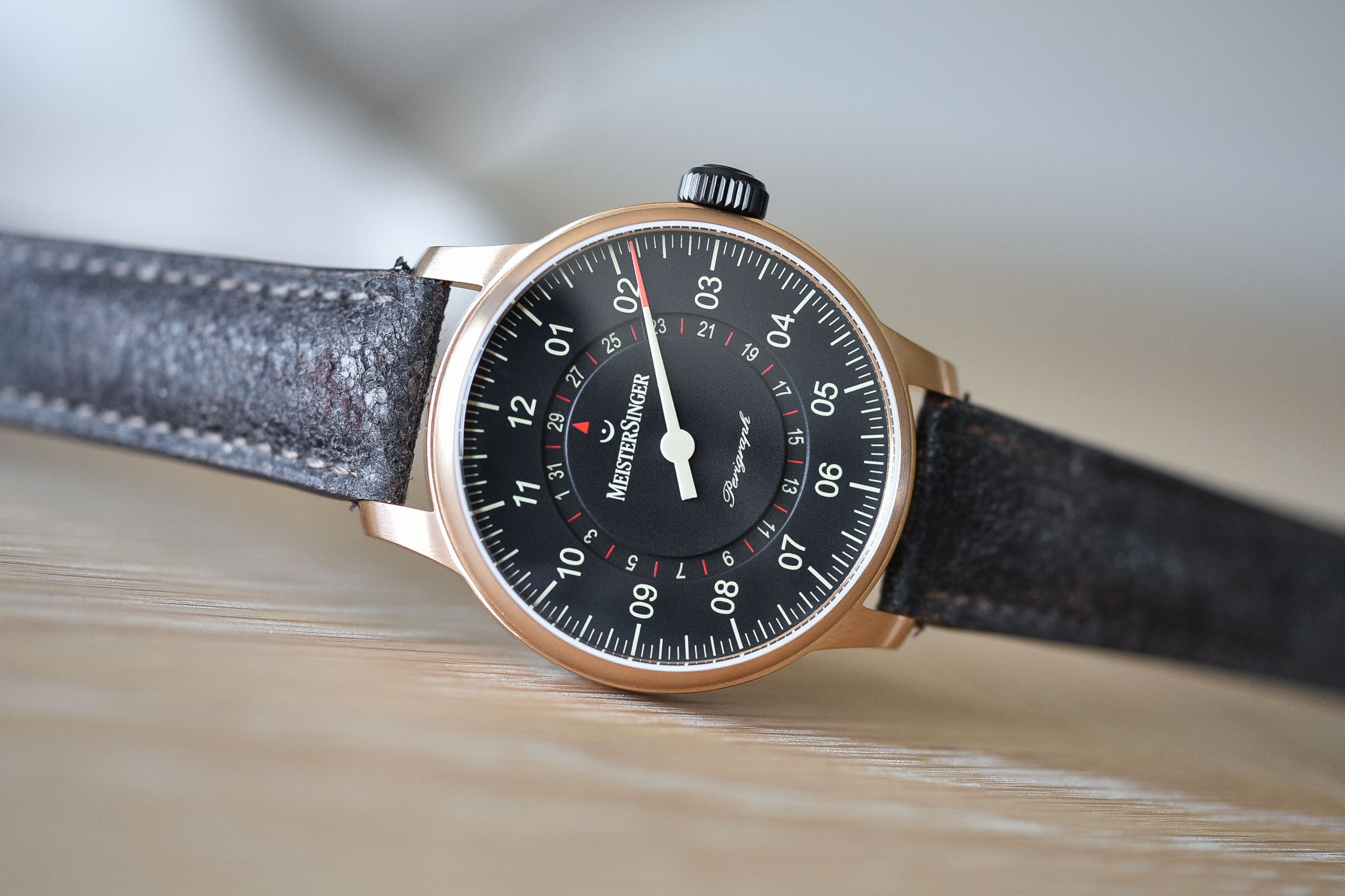 The recipient of many design awards and in circulation since 2013, the single-hand system of the Perigraph (and other MeisterSinger watches) is supposed to slow down the pace of things. The fact that there is nothing in fast motion on the dial, no small seconds hand or anything else in movement, gives the watch a more static, less animated presence that people who are not obsessed with millisecond timings might appreciate.