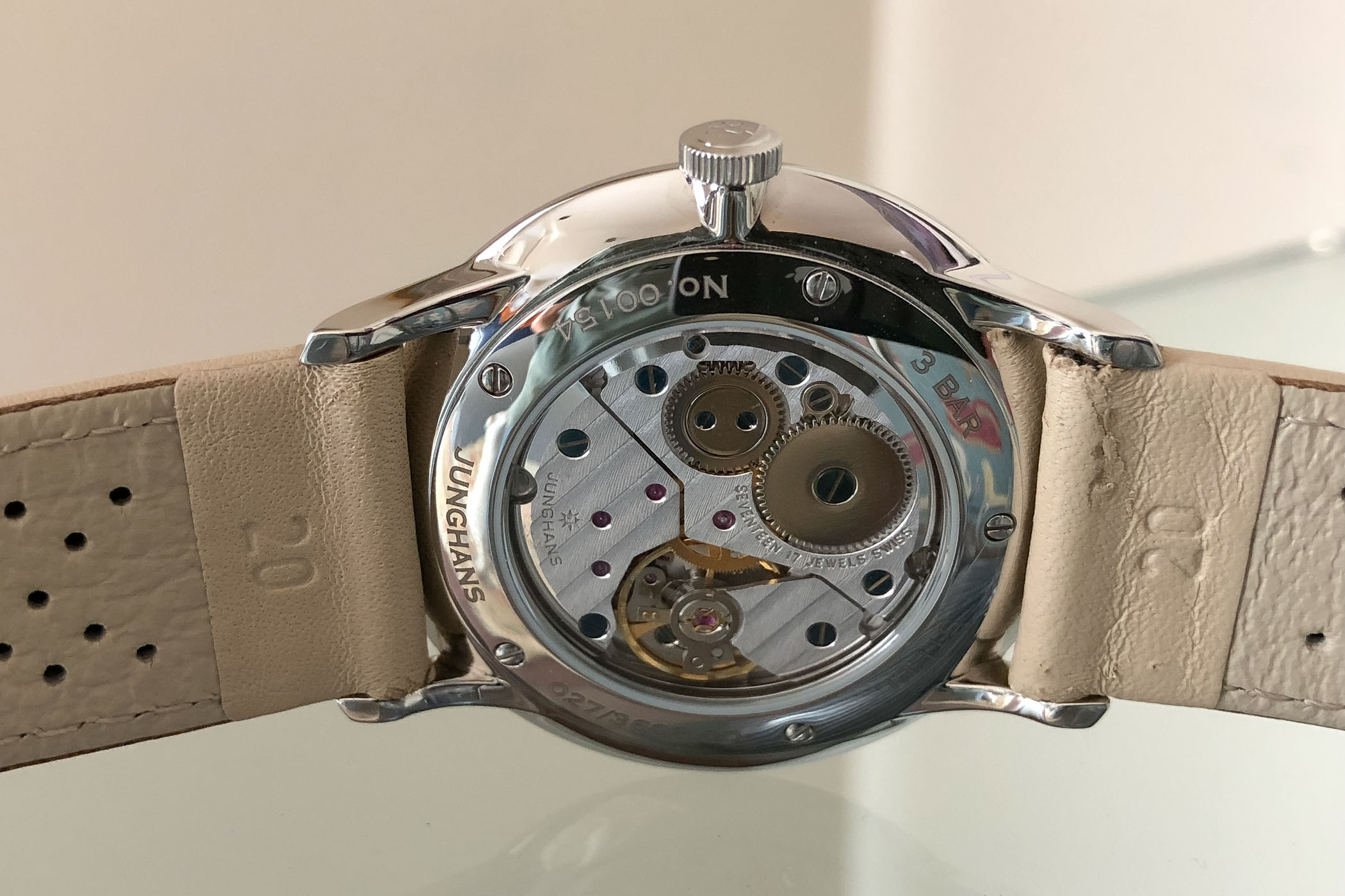 Unlike the traditional round case from Junghans, Farer produced a compact cushion case that’s 37mm in diameter with sapphire crystals on both the front and back. The dial is the star of the show, presented with multiple layers, colours and textures. A piquet textured main dial has small notches around its perimeter for each hour and a punched section for the recessed seconds sub-dial. Polished numerals and batons sit on this textured section, while the outer second layer of the dial is dark blue. Raised markers with Super-LumiNova mark the hours on the outermost perimeter and everything combines into a deceptively complex aesthetic. The same ETA 7001 calibre from the Junghans Meister powers the Stanhope.