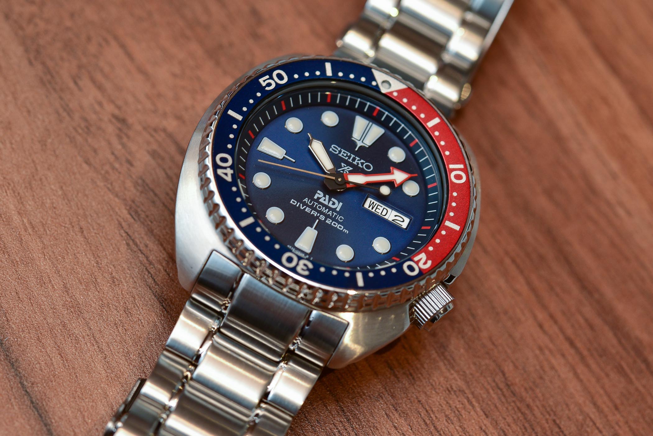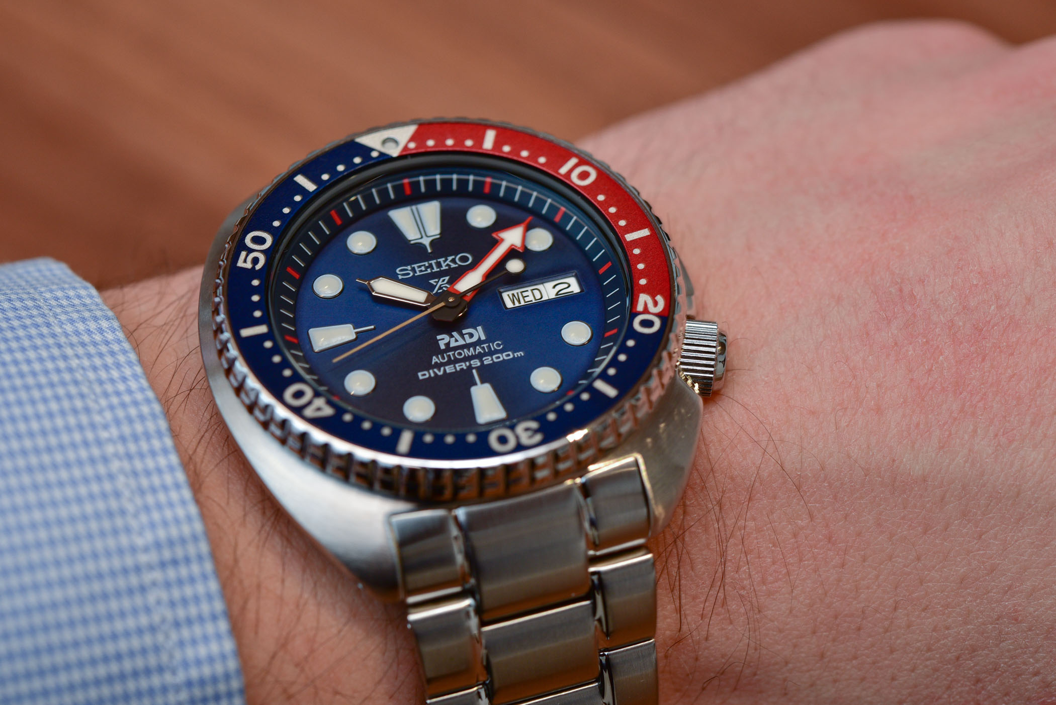 The movement in the Prospex Turtle is a Seiko calibre 4R36 automatic. It has 24 jewels, beats at 21,600vph (3Hz) with a 41-hour power reserve. It features a day and date complication with central hour, minute and seconds hands. Seiko’s in-house movements are reliable, serviceable and often inexpensive.