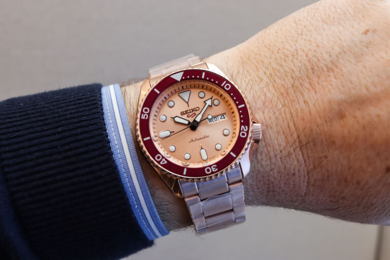 Here, you can see it photographed on the wrist of our editor Robin, who’s not a short guy, to say the least. His wrist is about 18cm or 7 inches in circumference, so he’s comfortable with 42mm or more. And yet, these compact 38mm Seiko 5 Sports look just about perfect on his wrist. And they do also on my own small 16.5cm wrist. Being made of steel with a steel bracelet, the case has a certain heft – about 140 grams with a full bracelet. But it’s consistent with the style and vocation of the watch. You won’t suffer from scoliosis after wearing it during the summer break.