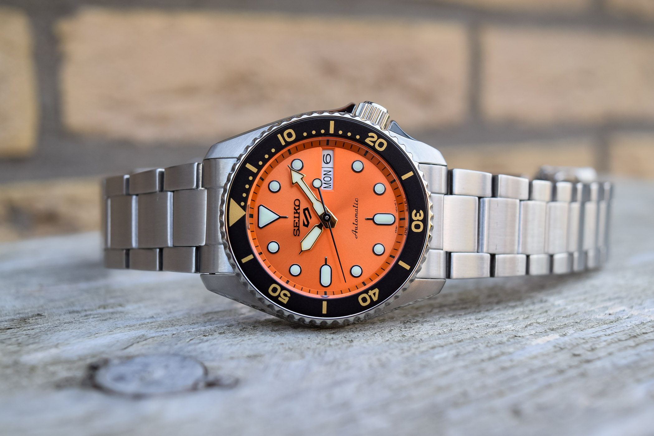 - SRPK35 – brushed orange dial, black bezel with orange scale, gold-coloured hands and dark grey-outlined markers