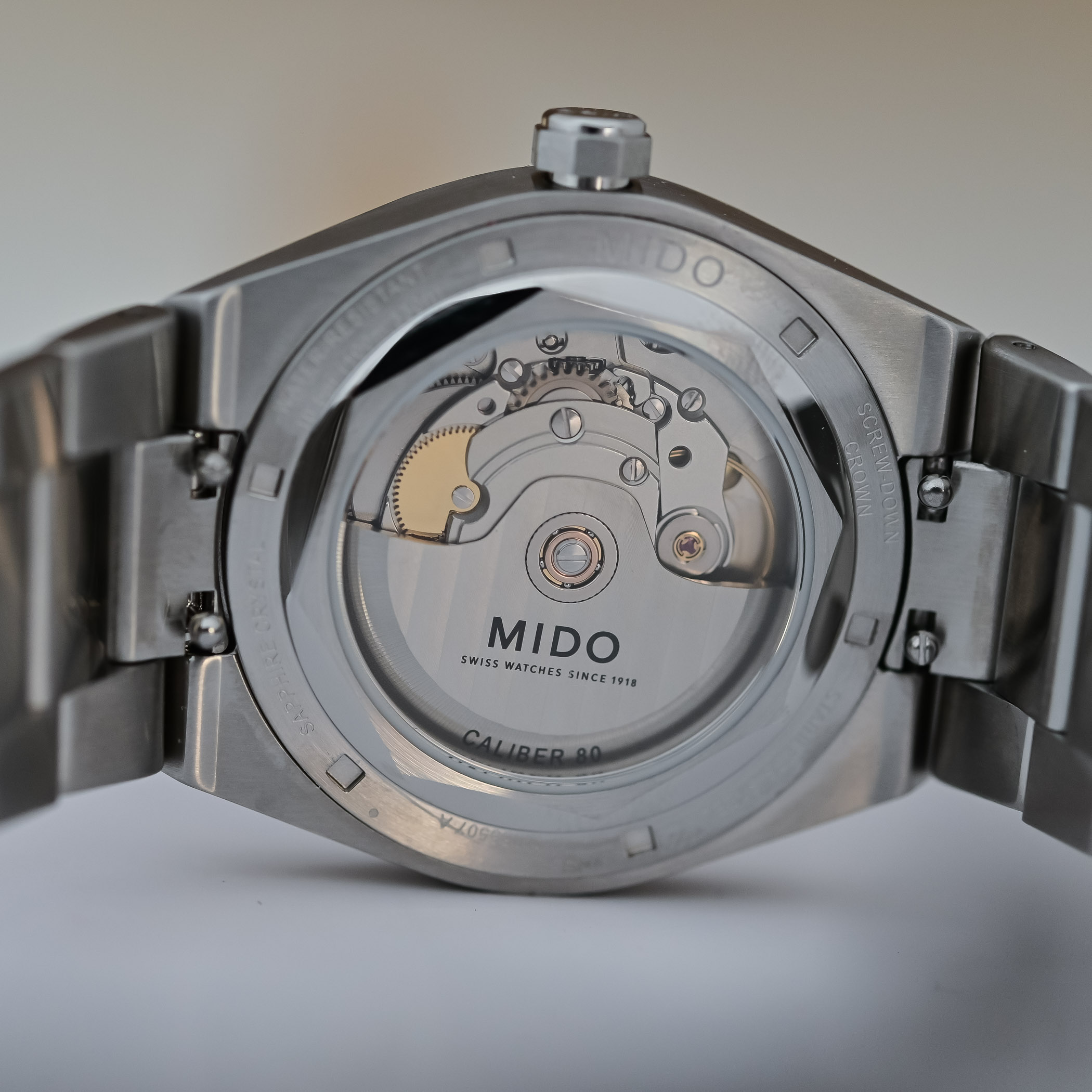 Powering the Multifort 8 One Crown is the Mido automatic Calibre 80 (Powermatic 80), based on the ETA C07.611. It has 25 jewels, a beat rate of 21,600vph (3Hz) and a sizable power reserve of 80 hours. Functions include central hours, minutes, hacking seconds and date. Seen from the exhibition case back, the signed rotor is decorated with Côtes de Genève.
