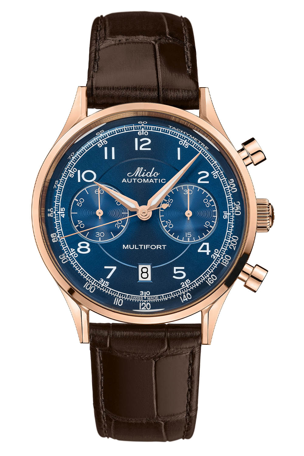 The bicompax dial of the Mido Multifort Patrimony Chronograph is deliberately playing on the retro trend too, with its domed profile, large Arabic numerals, sword faceted hands and its thin tachymeter scale on the periphery. The choice for only two counters makes for a balanced and uncluttered watch. In addition to the small seconds and 30-minute counter, the watch features a date window at 6 o’clock for visual balance. The dial, whatever the colour, is finely sunray-brushed with snailed sub-counters.