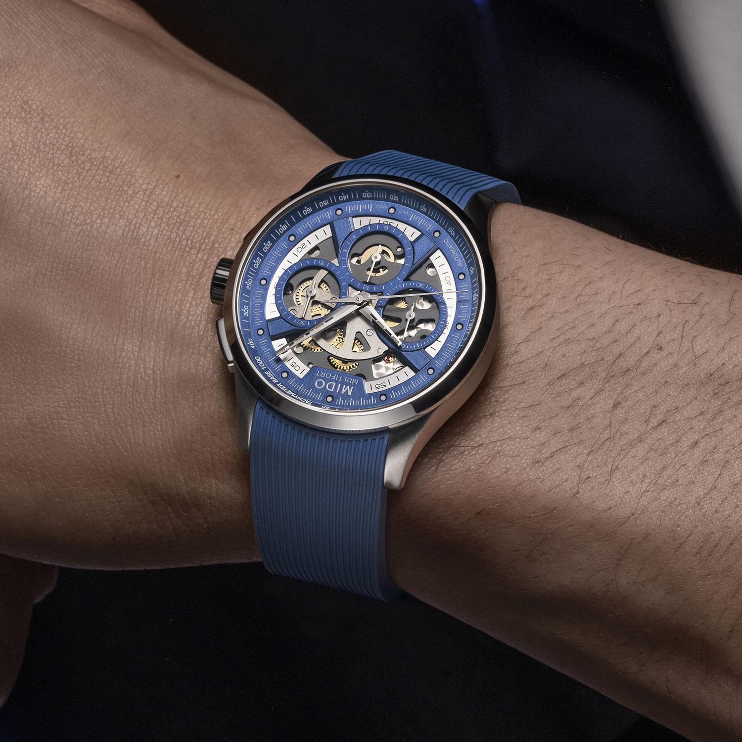 Each version of the watch is paired with a distinct strap or bracelet. The anthracite model comes on a stainless steel bracelet with a folding clasp, while the blue variant is matched with a textured blue rubber strap featuring a quick-change system. The black PVD model is fitted with a matching black rubber strap secured with a pin buckle. As for pricing, the blue rubber strap version is CHF 2,270, the anthracite on the bracelet is CHF 2,300, and the black edition comes in at CHF 2,380. For more information, visit midowatches.com.