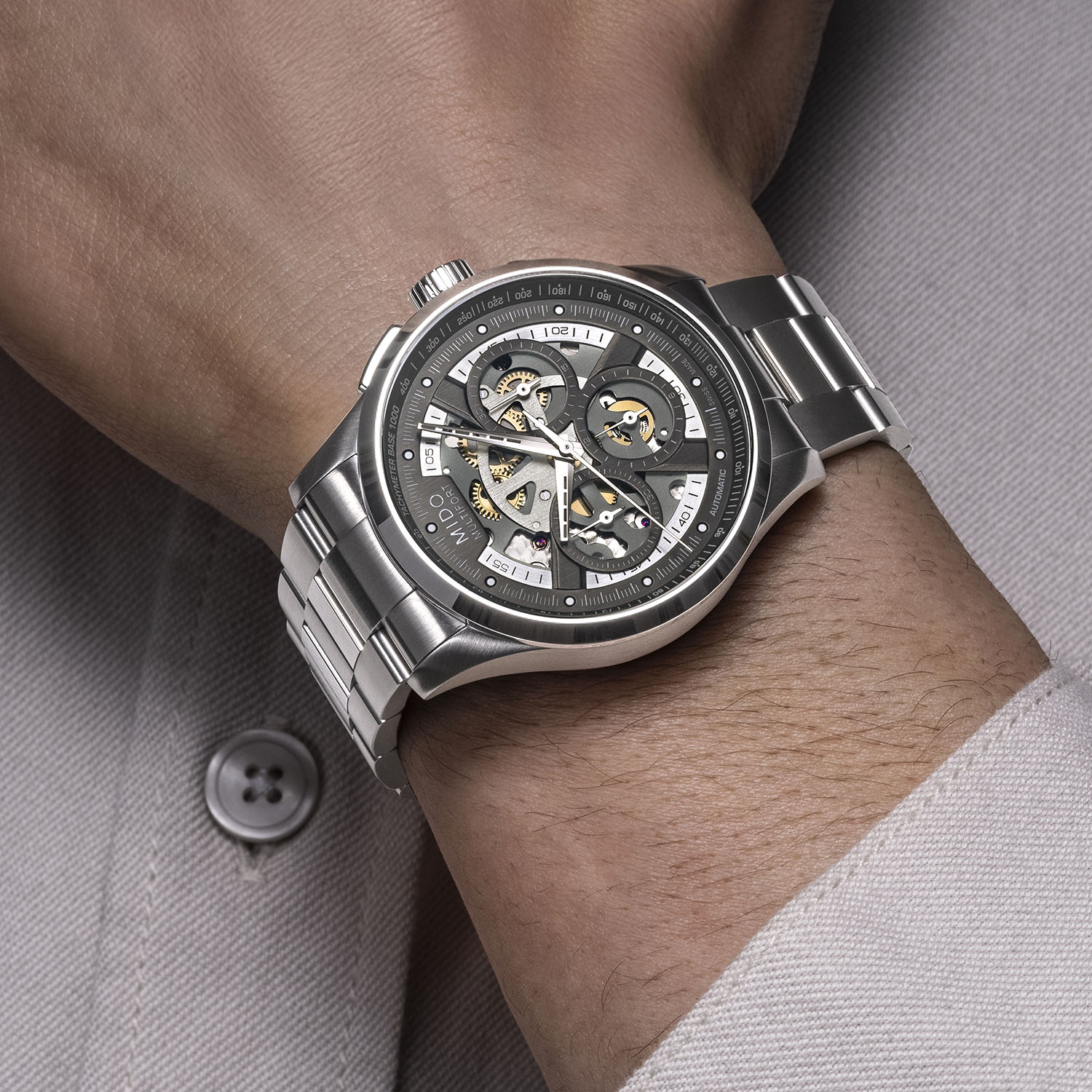 The new Mido Multifort Skeleton Chronograph references are presented in a polished stainless steel case, water-resistant to 100 meters. The three-part case measures 43mm in diameter, 14.4mm thick, and 50.67mm lug-to-lug and features sapphire crystals with anti-reflective coating on both sides and a fluted screw-down crown at 3 o’clock, flanked by rounded rectangular chronograph pushers that balance sportiness with style.