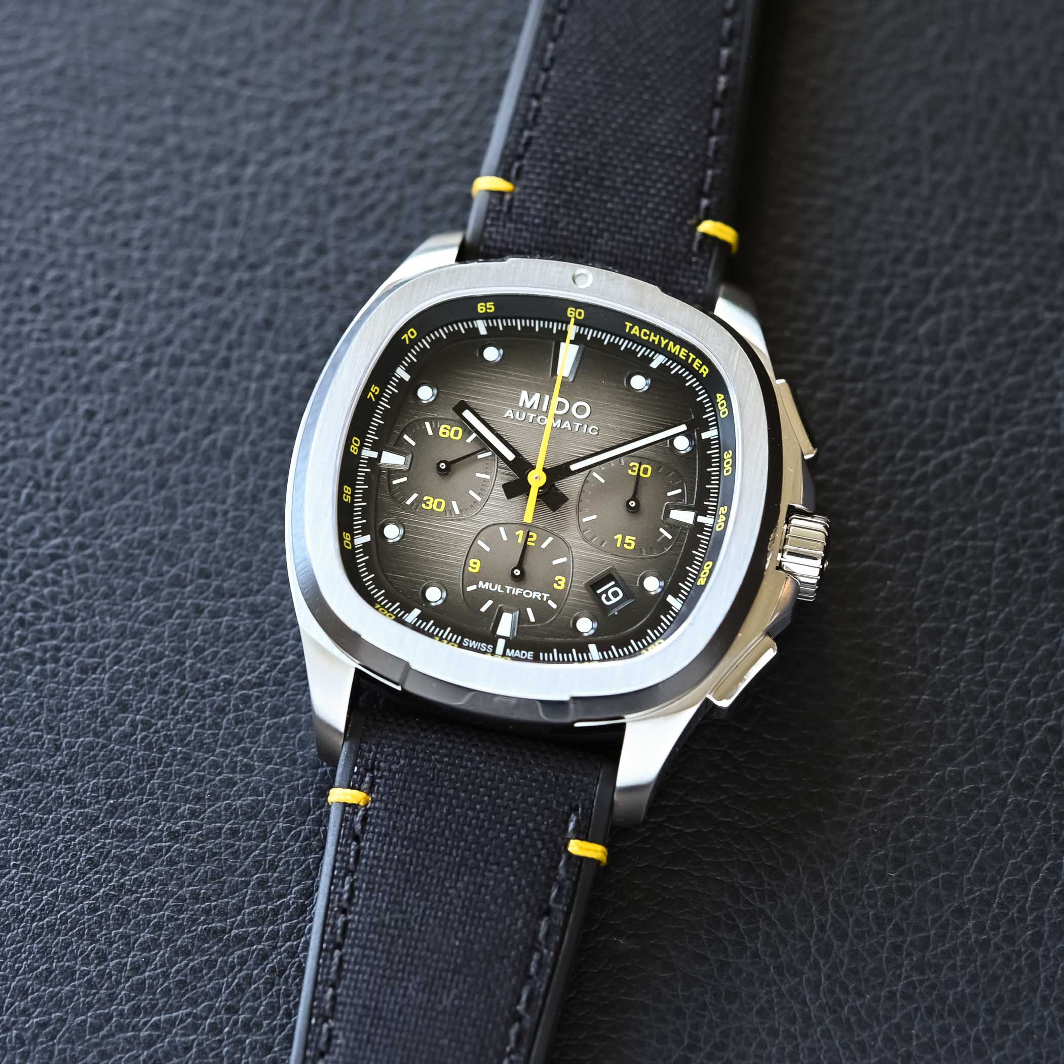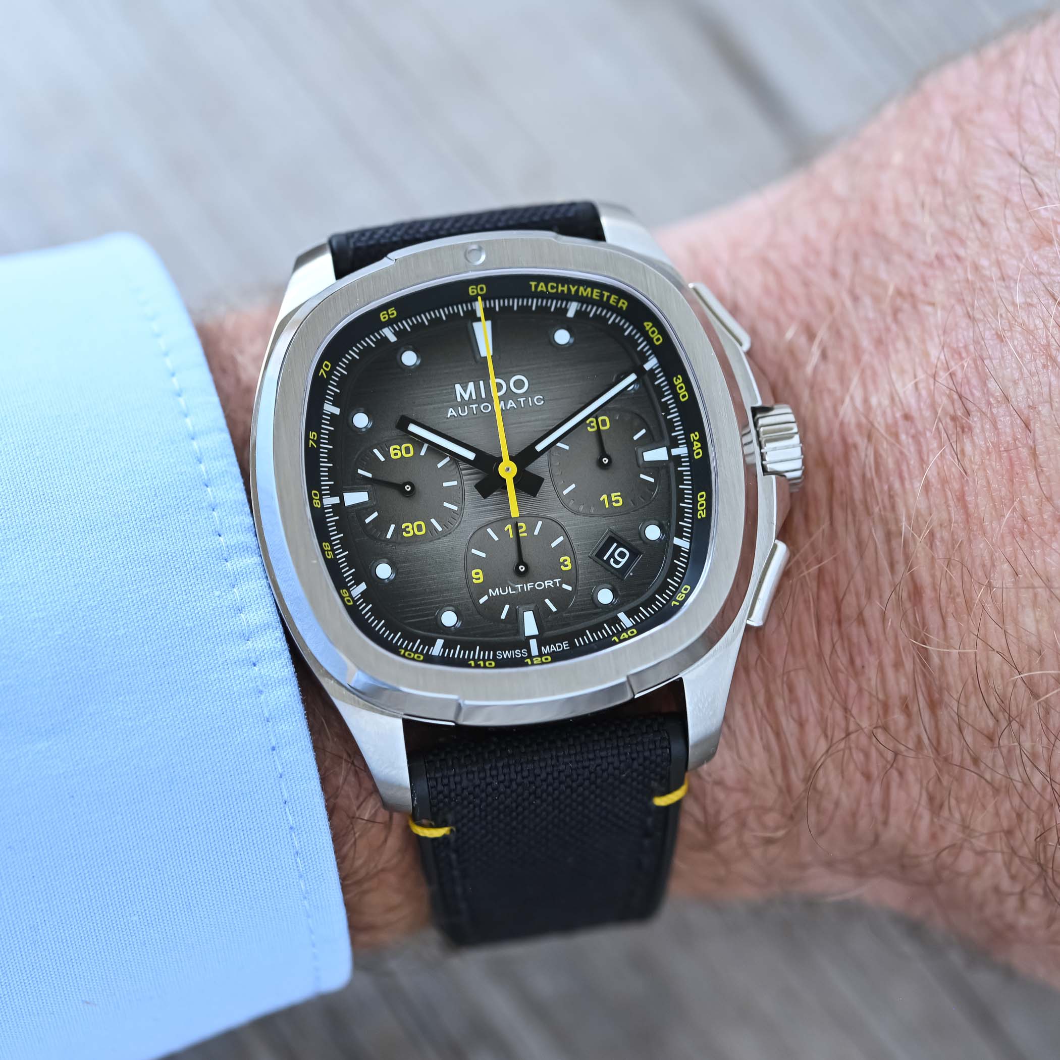 For the dial, Mido opted for something we know from previous non-chronograph editions of the Multifort TV range. It’s available in classical blue, with a subtle gradient to black towards the outer edge, or in a grey-to-black gradient. Steel and blue is a very safe bet, but it offers great style and legibility thanks to polished steel hands and white markings all around. The grey/black dial spices things up a little with a tachymeter scale (and other details) in yellow instead of white, and mostly black hands with Super-LumiNova. As ever, the dial gets a real sense of depth thanks to horizontal grooves, raised hour markers and a framed date window (which has now shifted to 04:30).