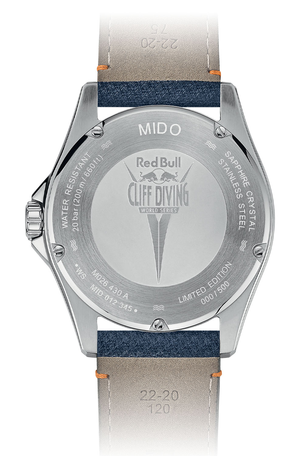 The Mido Ocean Star 200 Red Bull Cliff Diving Limited Edition (ref. M026.430.17.041.00) will be produced in 500 pieces and is now available from Mido’s website and retailers. It is priced at EUR 960, CHF 990 or USD 970.