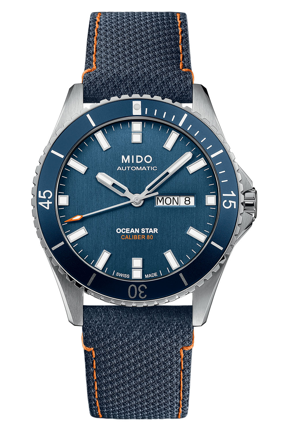 The main specificity of this Red Bull Cliff Diving Limited Edition comes from its colour scheme and dial finishing. Framed by a unidirectional bezel with a blue aluminium insert, the dial is vertically brushed and has an ocean blue colour. It features applied indexes and hands generously filled with Super-LumiNova and an orange-tipped seconds hand. This bright shade – Mido’s signature colour – also brings out the “Caliber 80” inscription at 6 o’clock. In addition to the three main hands, this edition of the Mido Ocean Star 200 displays a day-date complication.