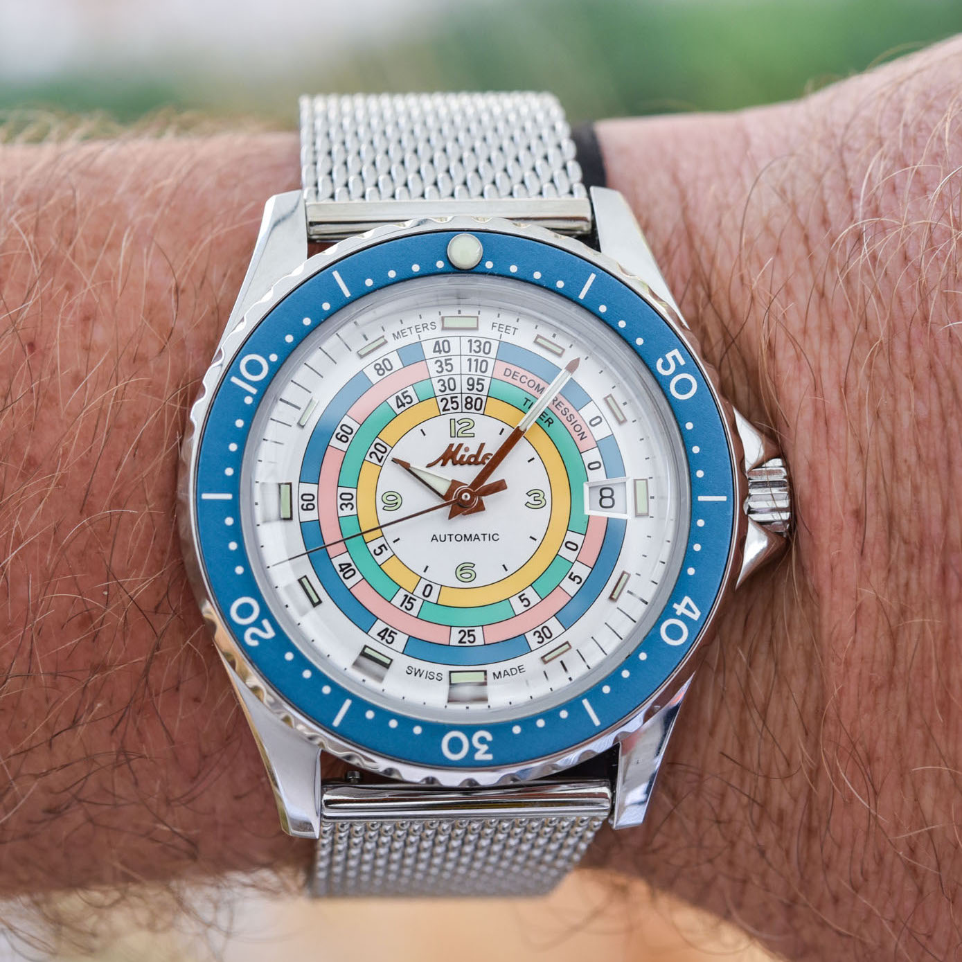 Mido hits the bull’s eye with this attractive and colourful homage to a 1961 diving legend known as the “Rainbow”.