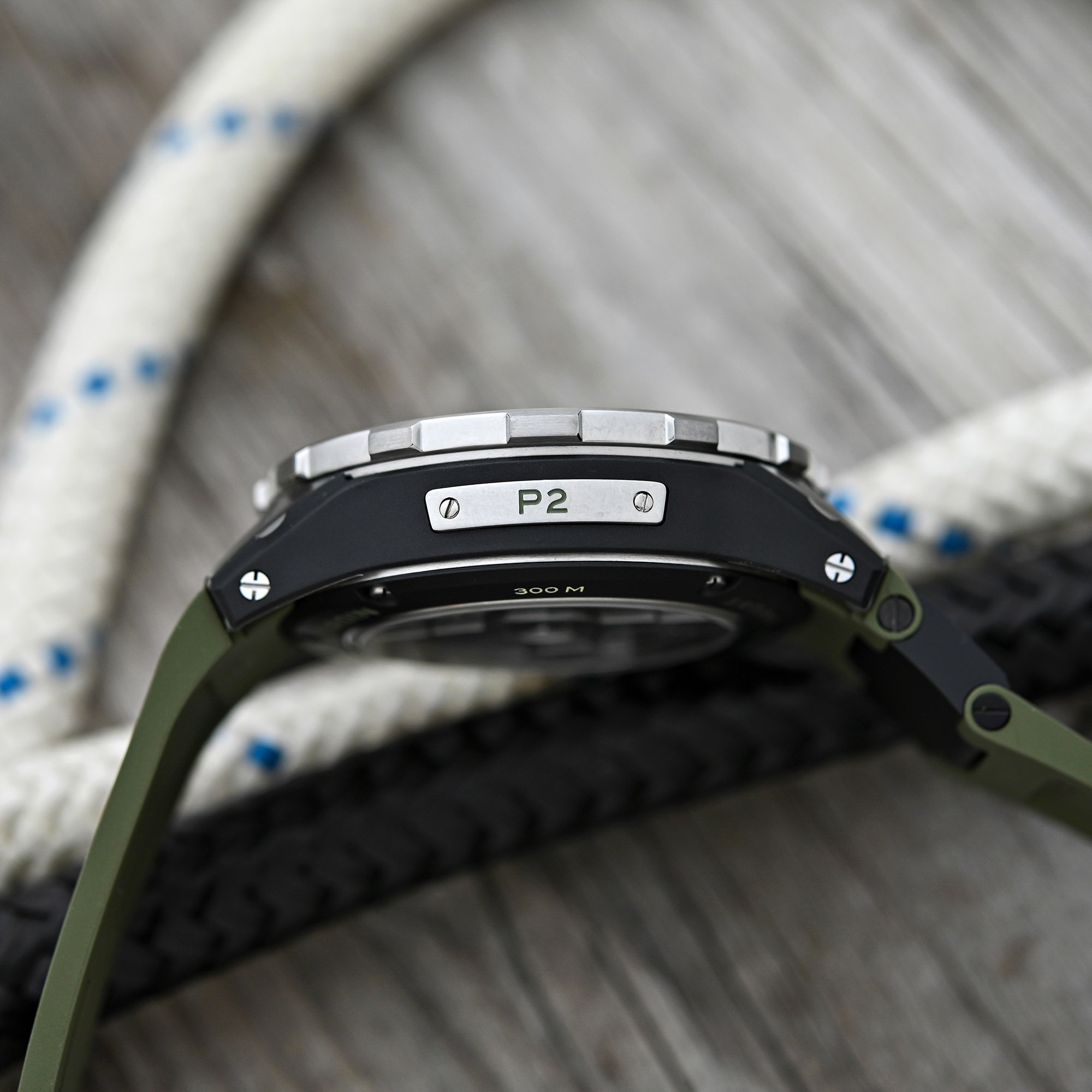 The more rugged 300m water-resistant Diver Net Ops comes in a 44mm case. Using Nylo (recycled fishing nets) and Carbonium (carbon fibre used for fuselage and wings of aircraft) for the flanks and caseback combined with recycled stainless steel for the movement holder, the brand claims the watch reduces its environmental impact by 40% compared to traditional cases. To complete the materials menu, the marbled unidirectional rotating bezel is made of Carbonium and the khaki green strap is partially made from recycled fishing nets. The watch can also be ordered with a green rubber strap and a black ceramic UN element.