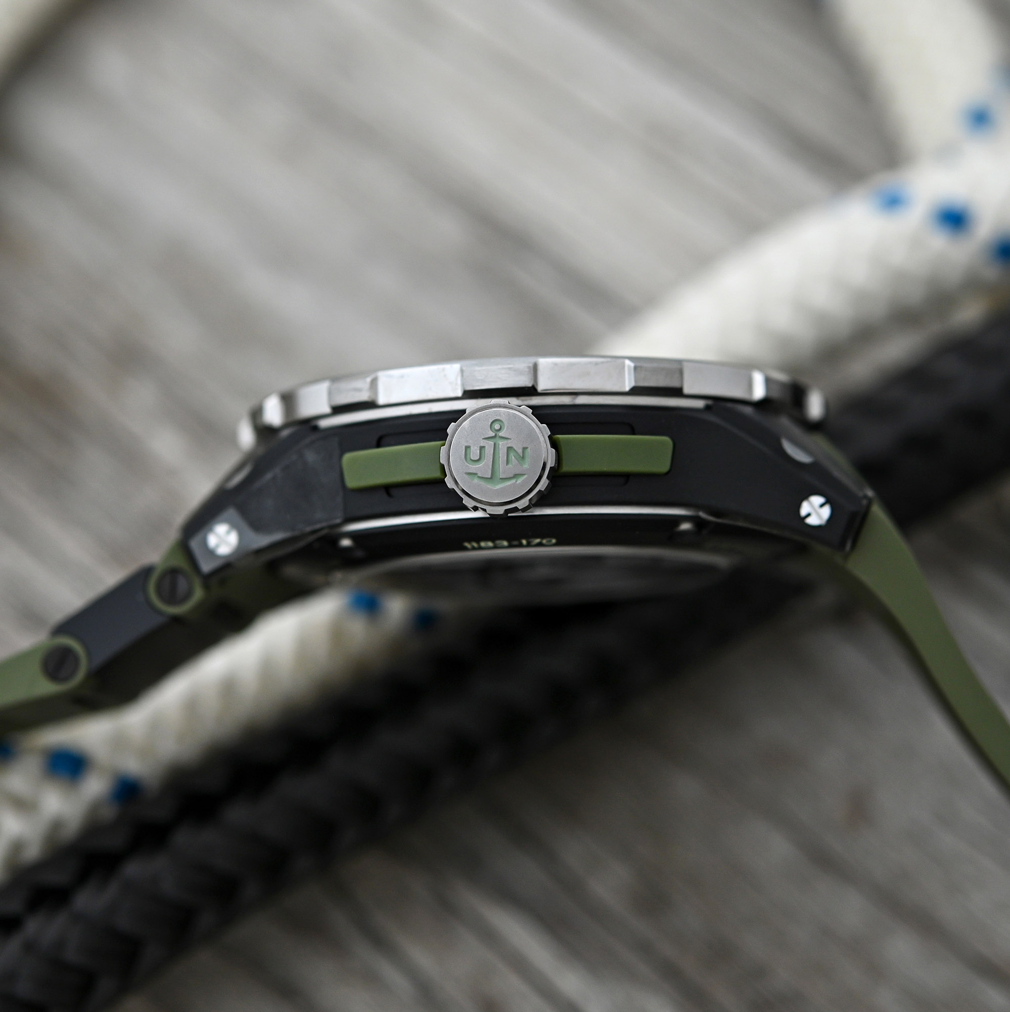 Quick facts: 44mm x 15.7mm – Carbonium rotating bezel, black DLC titanium case and caseback, sandblasted – domed sapphire crystal over dial, open sapphire caseback – 200m water-resistance – openworked dial with X shape, barrel cover in Carbonium, black indices and hands with beige Super-LumiNova – skeletonised automatic manufacture calibre UN-372, 21,600vph, oscillator with silicium escapement, anchor and balance spring, 72h power reserve –green fabric strap partially made from upcycled fishing nets or green rubber strap with ceramic and titanium deployant buckle – CHF 26,100 / EUR 27,570 / GBP 24,230 (all incl. VAT)