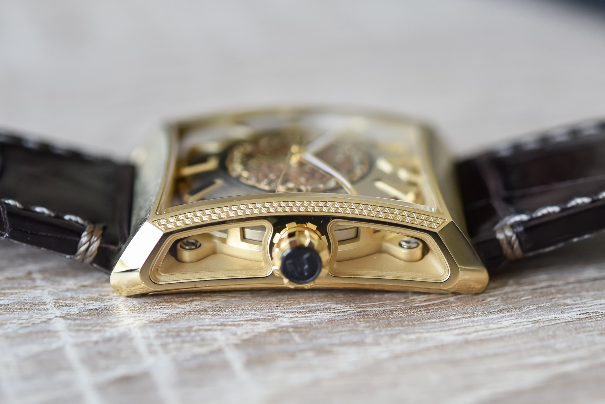 Quick facts: yellow gold case – 38mm x 51mm x 12mm – 5 sapphire crystals with A/R coating – water-resistant to 50m – automatic movement (base ETA2824) – alligator leather strap with gold pin buckle – CHF 44,500 in yellow gold with 2 sides engraved