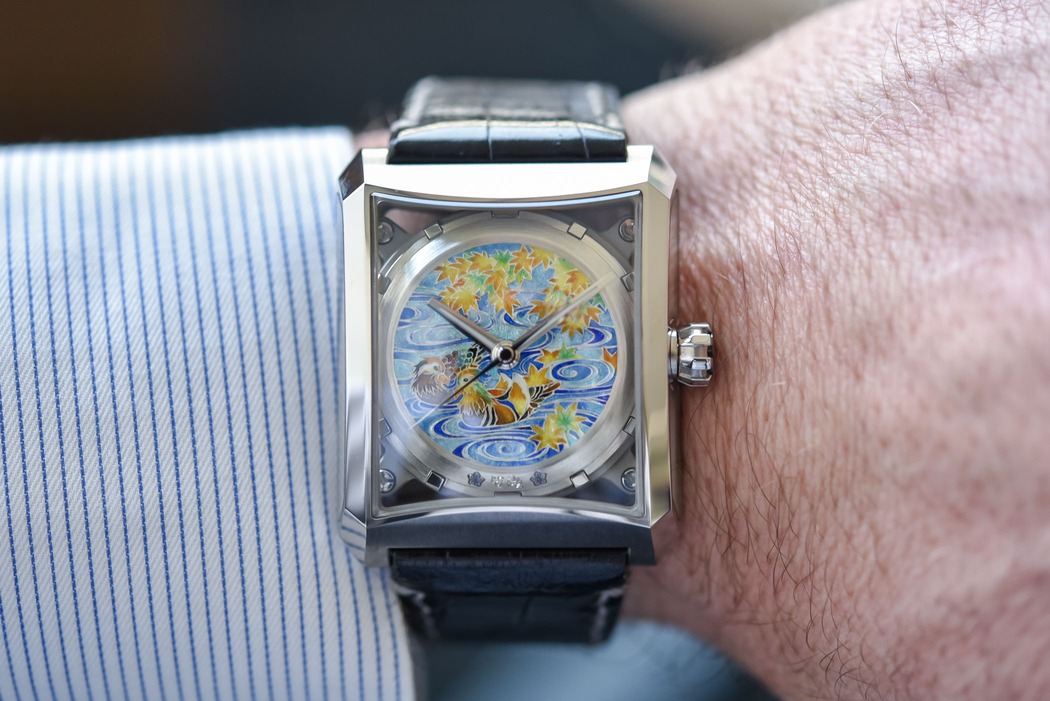 With champlevé enamel, cells are carved out a plate (here in silver), then filled with colourful enamel layers that are successively fired in a kiln. The dials are crafted by Japanese craftsman Kenji Kanagawa. Each design is released in a series of no more than eight pieces. The model pictured here is called Minase ‘One’. It is a tribute to Akita and features ducks in water and maple leaves. The full rotor is richly decorated and lacquered.
