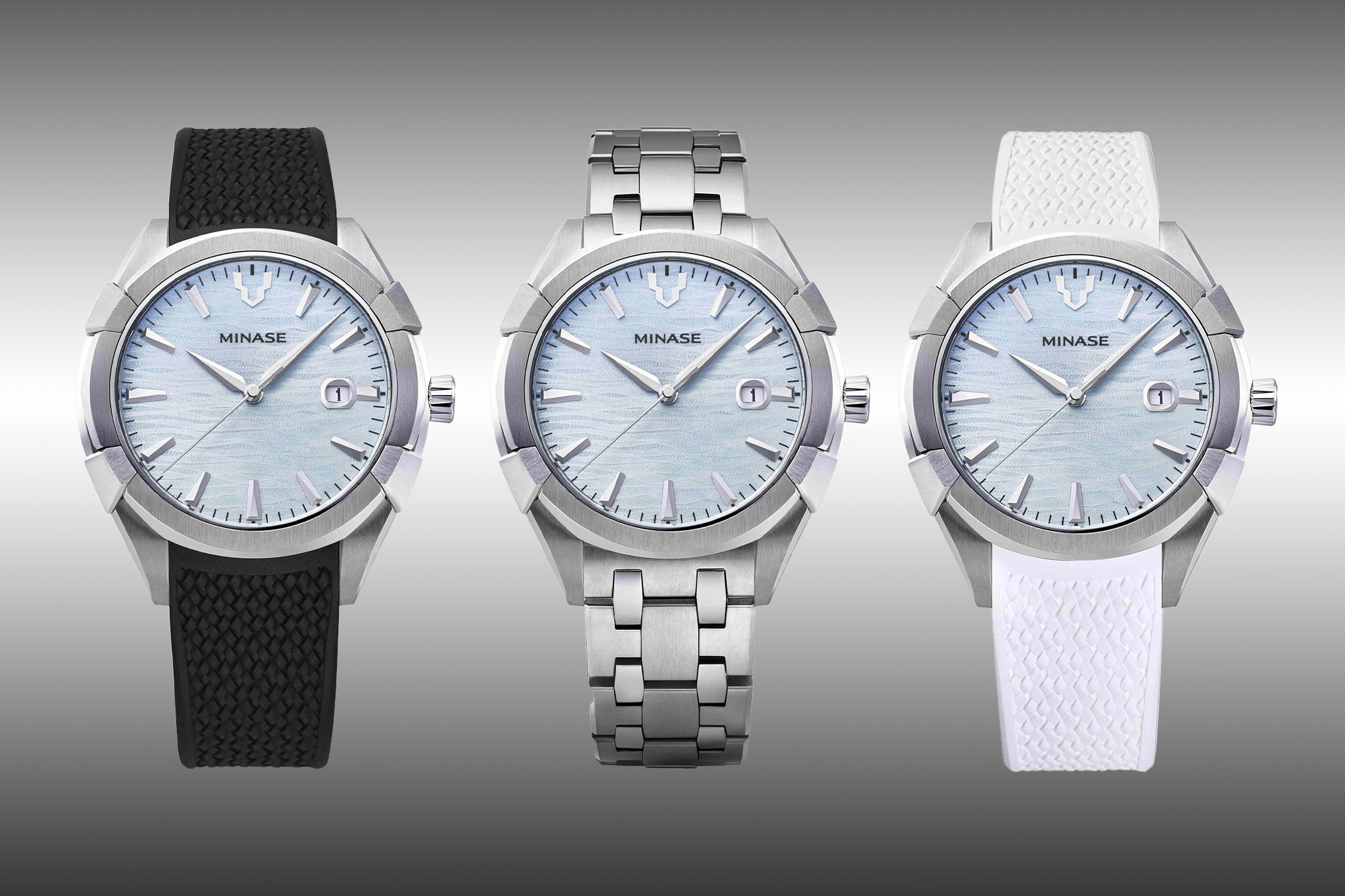 The Minase Uruga 42mm Automatic Ice Blue Dial is offered on either a textured rubber or hand-stitched leather strap with deployant clasp or a stainless steel bracelet. Pricing starts at USD 5,500 on rubber and leather, USD 7,100 on steel bracelet.