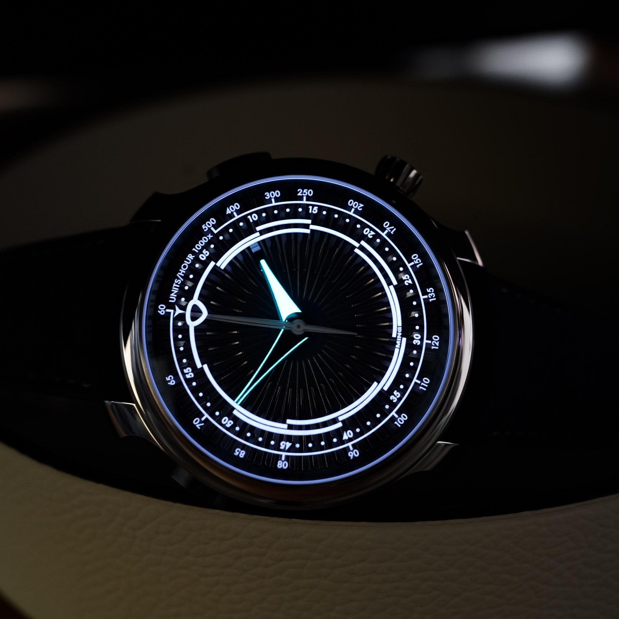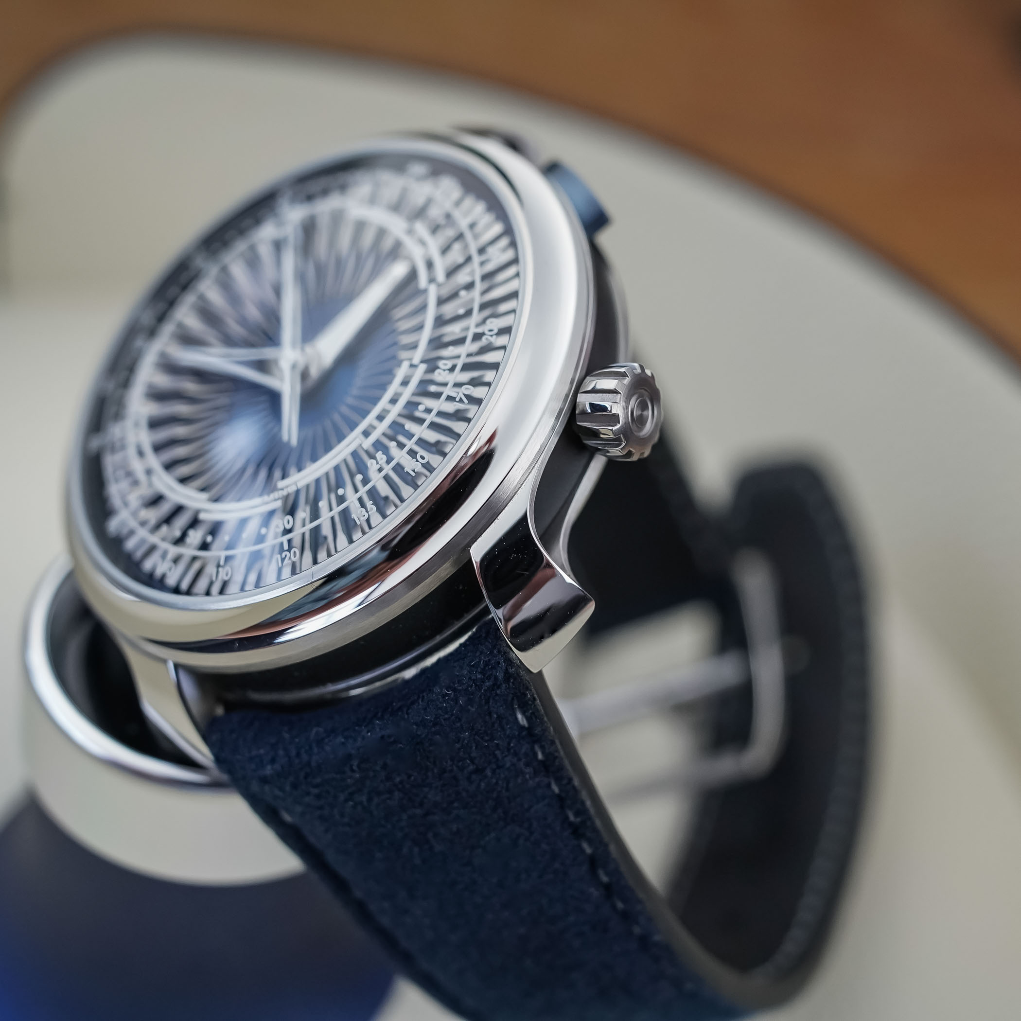 There’s a sapphire crystal on top, which comes into play later as well, and another one around the back. Moving to the dial is where things get really impressive. The 20.01 Series 5’s dial looks like the Starship Enterprise has just launched itself into hyperspace! Laser-milled from a single block of titanium, it’s given a blue CVD coating before being detailed by laser even further. The result is a dial with complex radial strakes, giving it a tremendous sense of depth and life, almost resembling the fan of a jet engine.