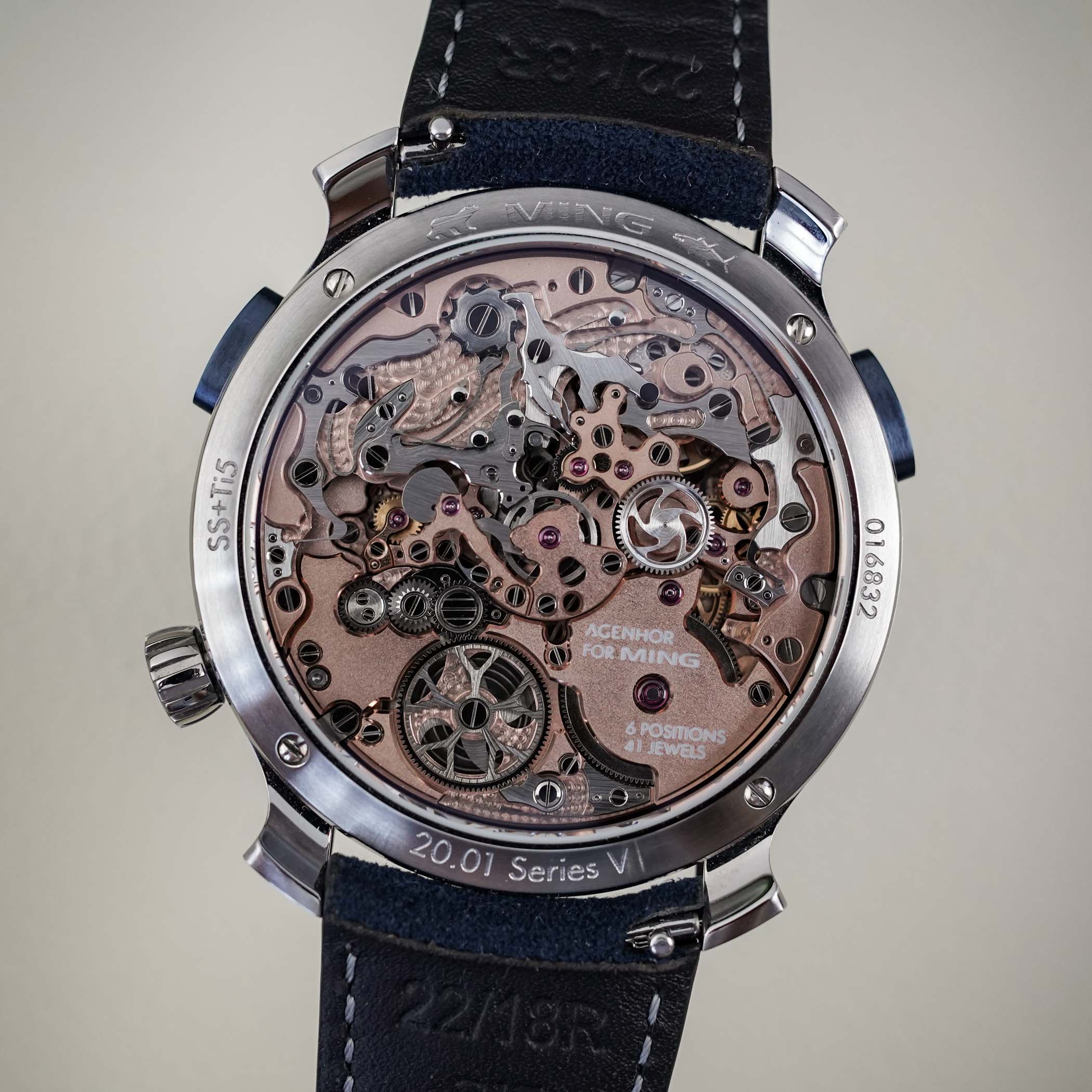 As I said, Ming uses the brilliant AgenGraphe by Agenhor for the 20.01 Series 5, just as it has in previous versions. In this case, it’s the calibre 6361.M1, which is a manually wound chronograph movement with a rather special construction. Where conventional chronograph movements put the seconds in the centre, and the remaining indications in sub-registers, this one doesn’t. Not only does it have central hour and minute hands for the running time, but it also indicates the chronograph seconds and minutes from the centre.